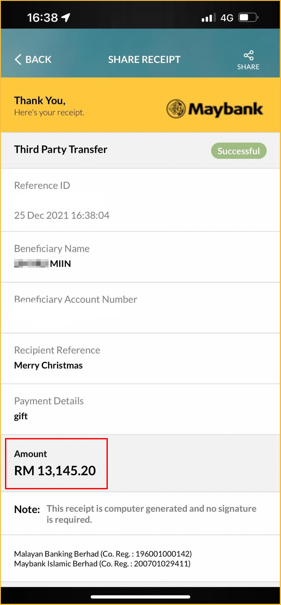 ▼ 老公甜蜜转账送圣诞节红包给老婆,备注“圣诞节快乐!请查收妳的礼物!” 现金RM13,145.20成功到账!