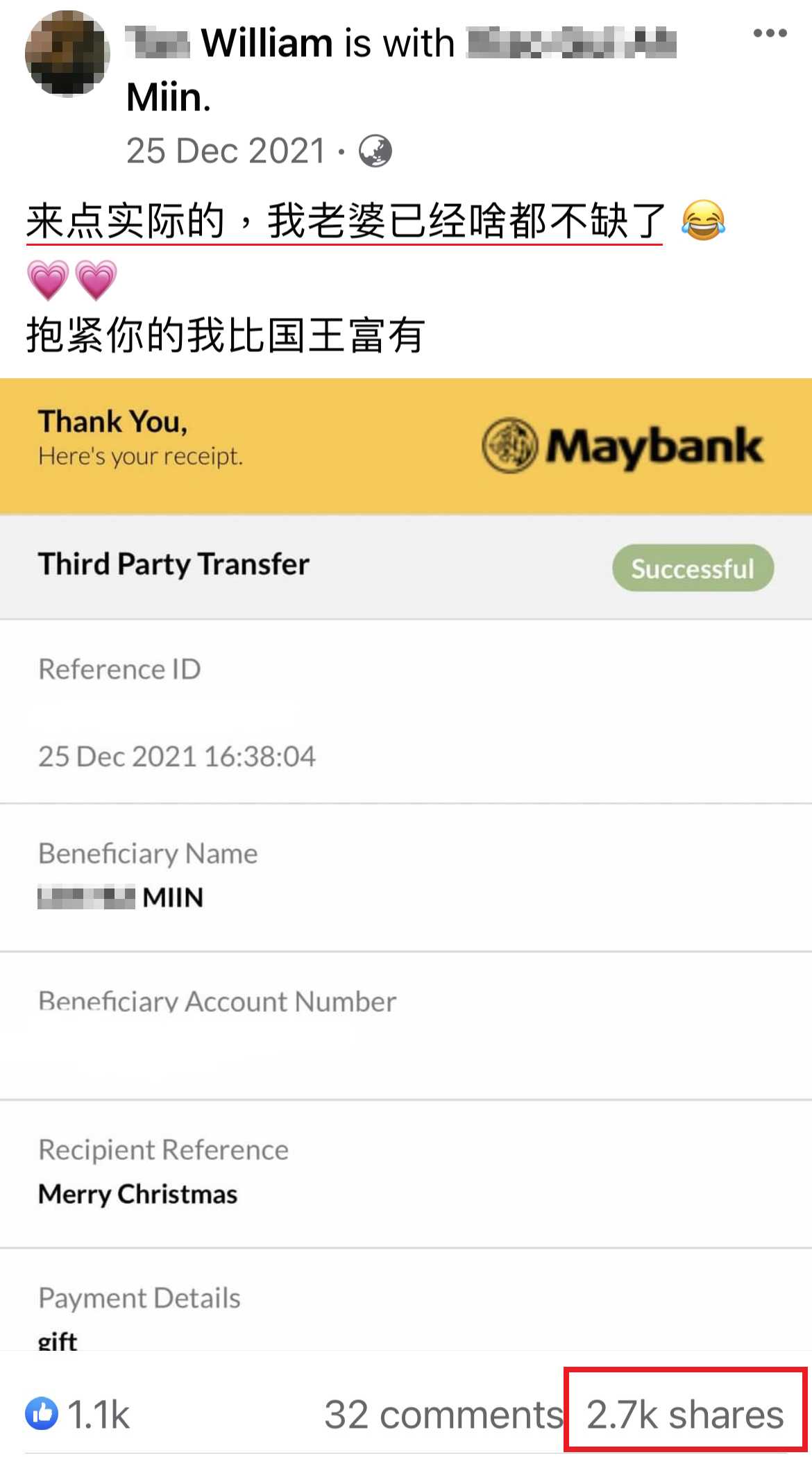 又是别人的老公!送圣诞节礼物「转账RM13,145.20」:老婆什么都不缺给她来点实际的!