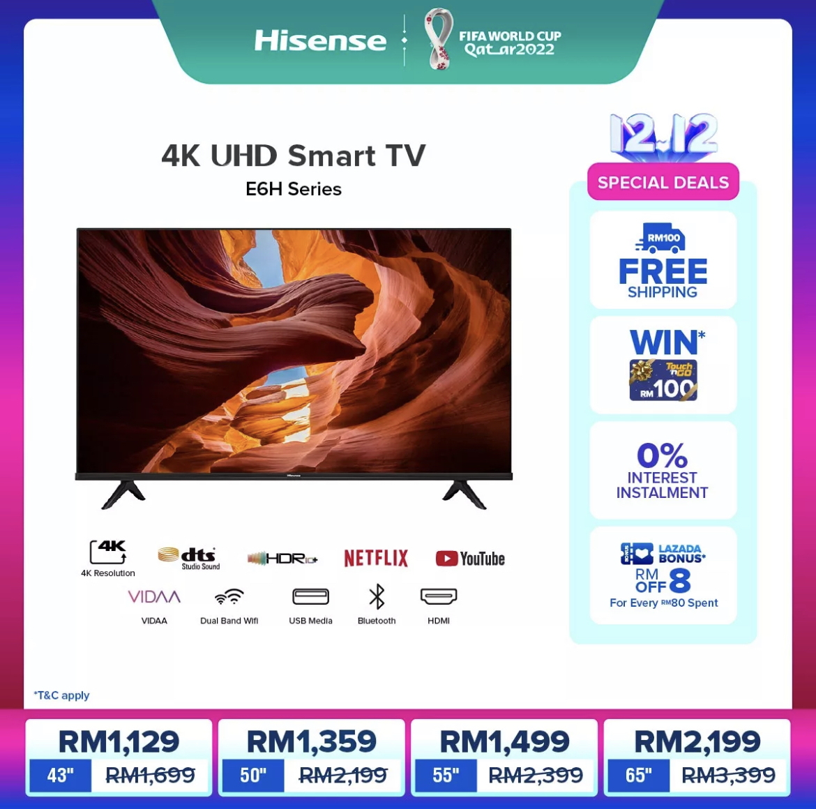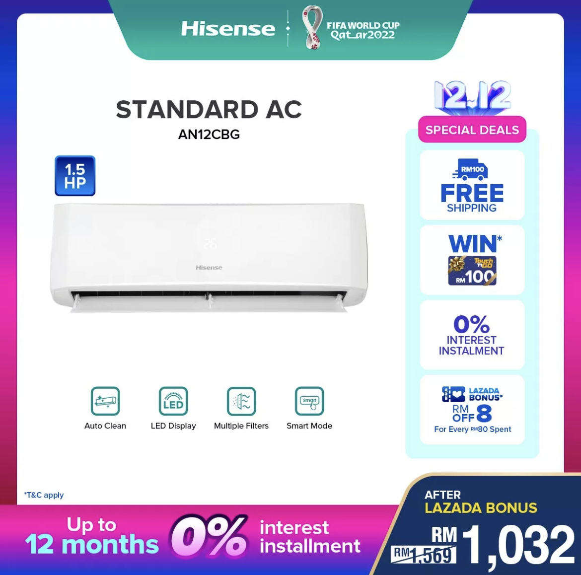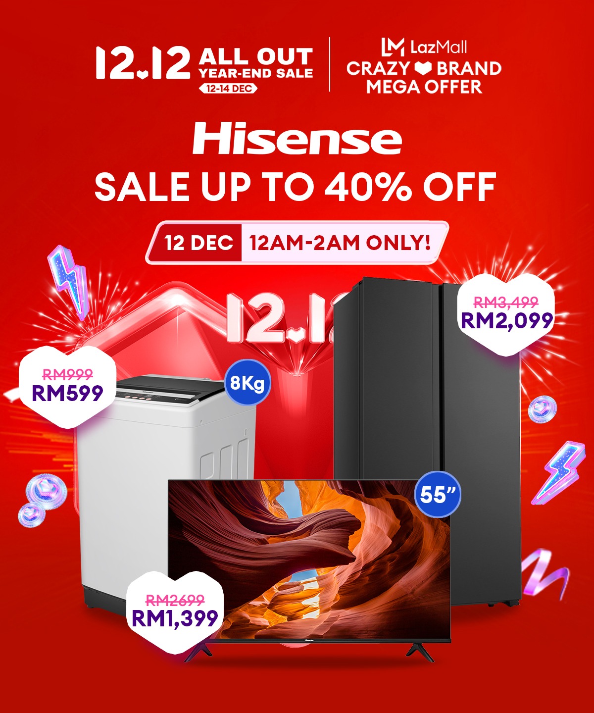 Hisense x LazMall 举办12.12大优惠,家电折扣高达40%!除了额外折扣券,还有 Lazada Bonus 每RM80就扣RM8!这次不买一定会后悔!