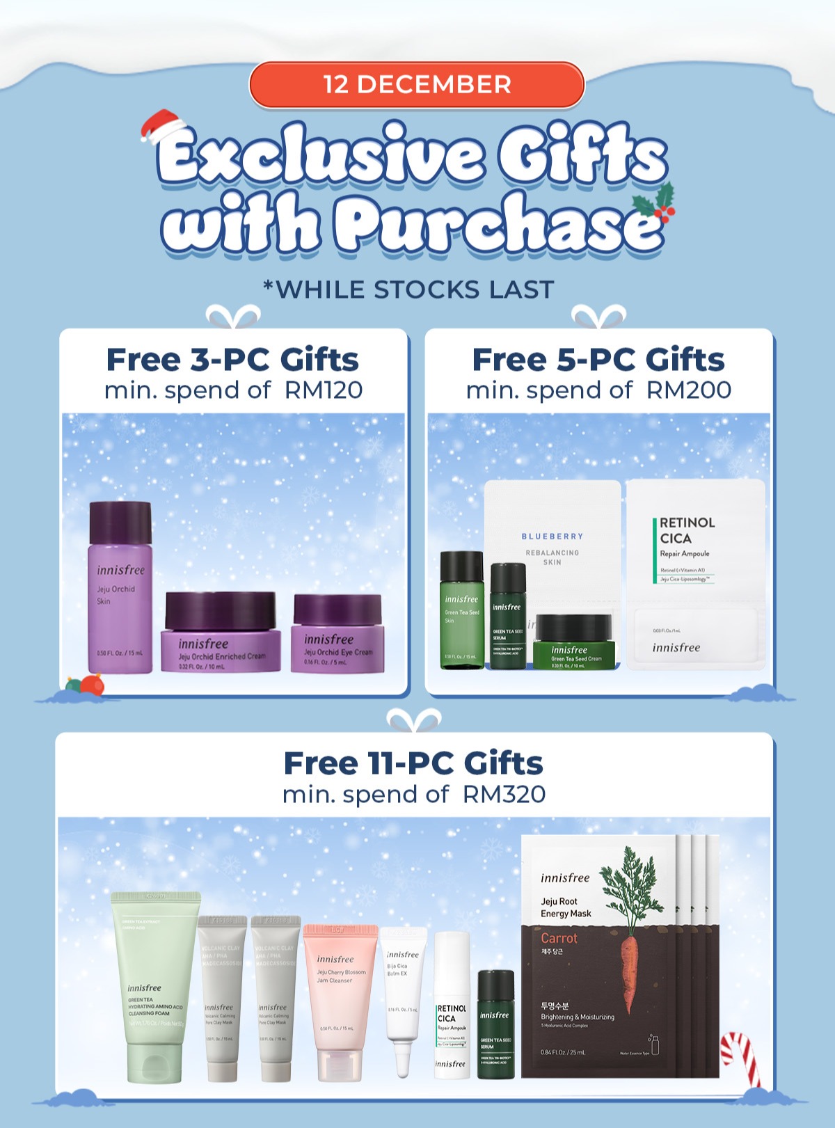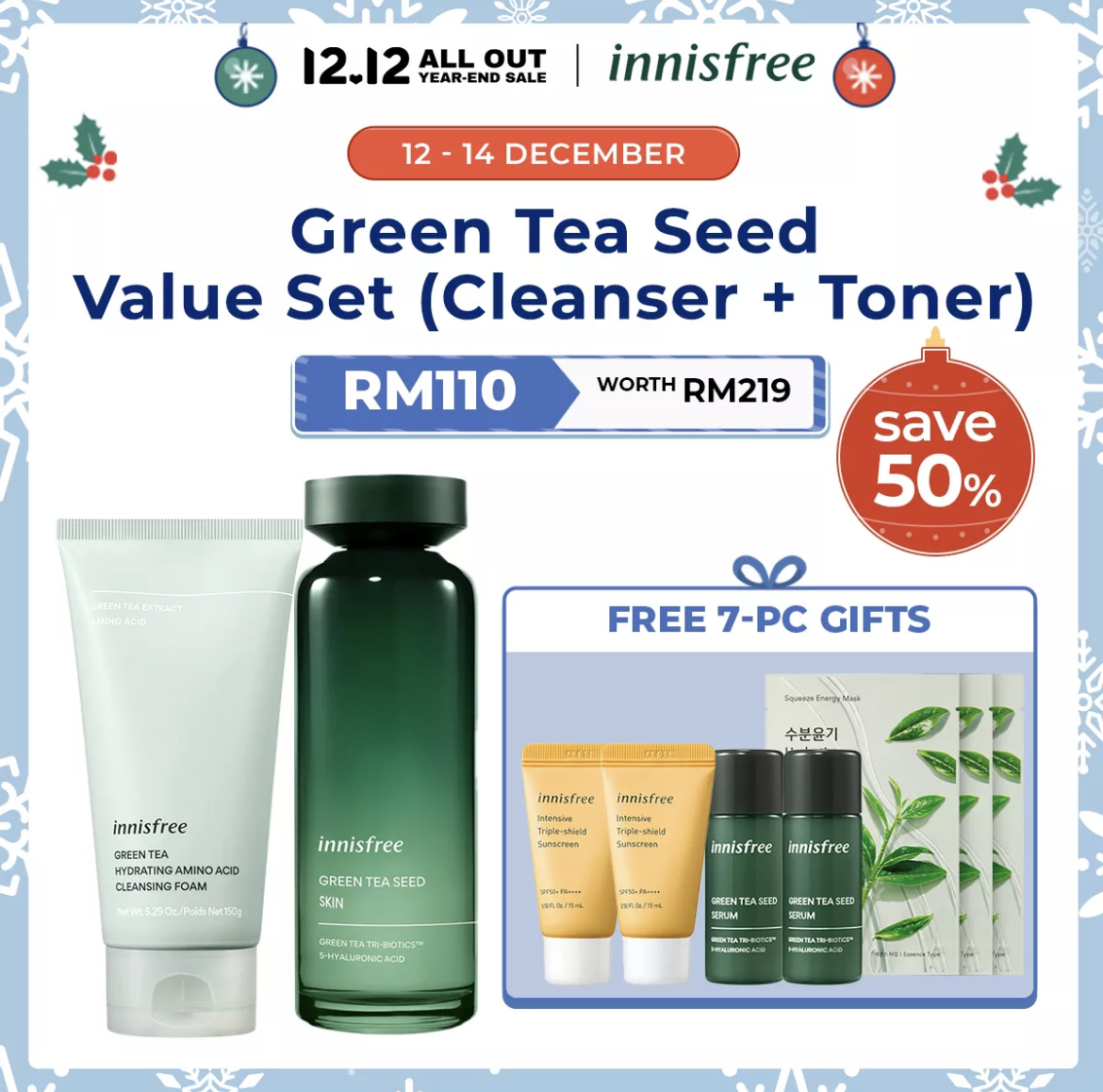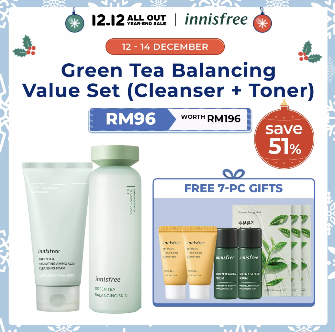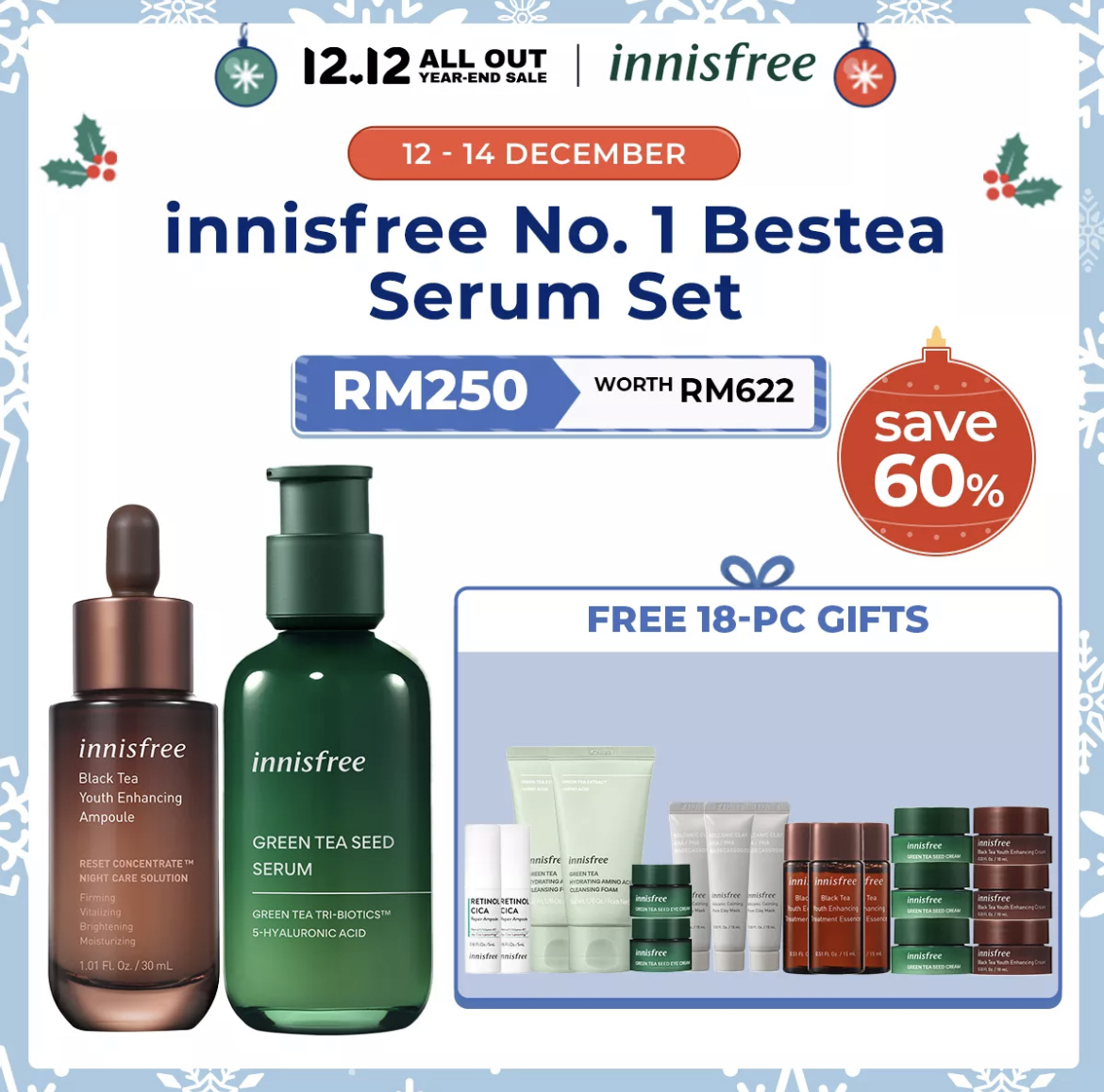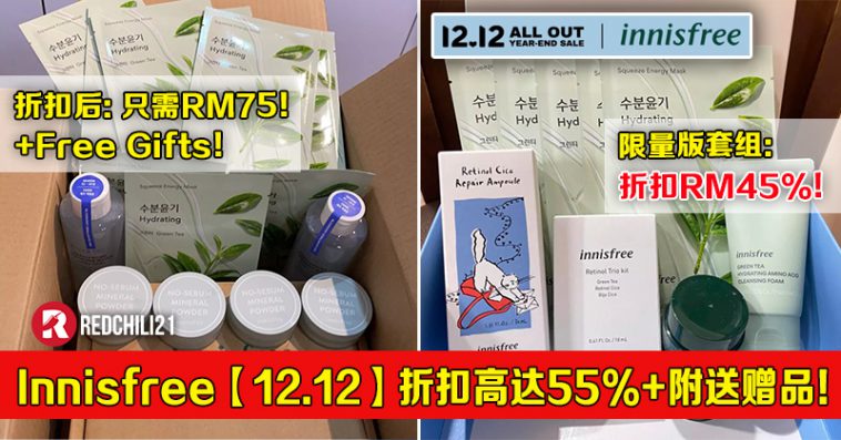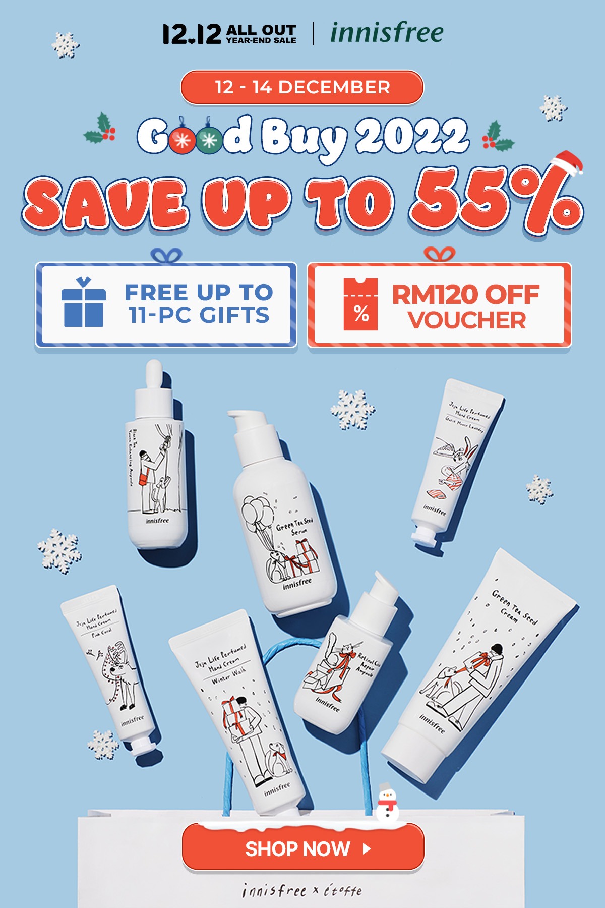 现在买还来得及!Innisfree Lazada 旗舰店连3天12.12促销活动,护肤品折扣高达55%!购买套组附送赠品,最低RM75即可入手!