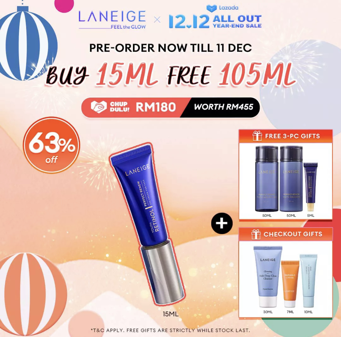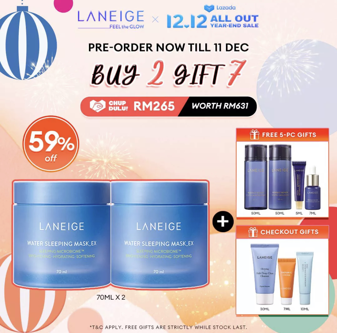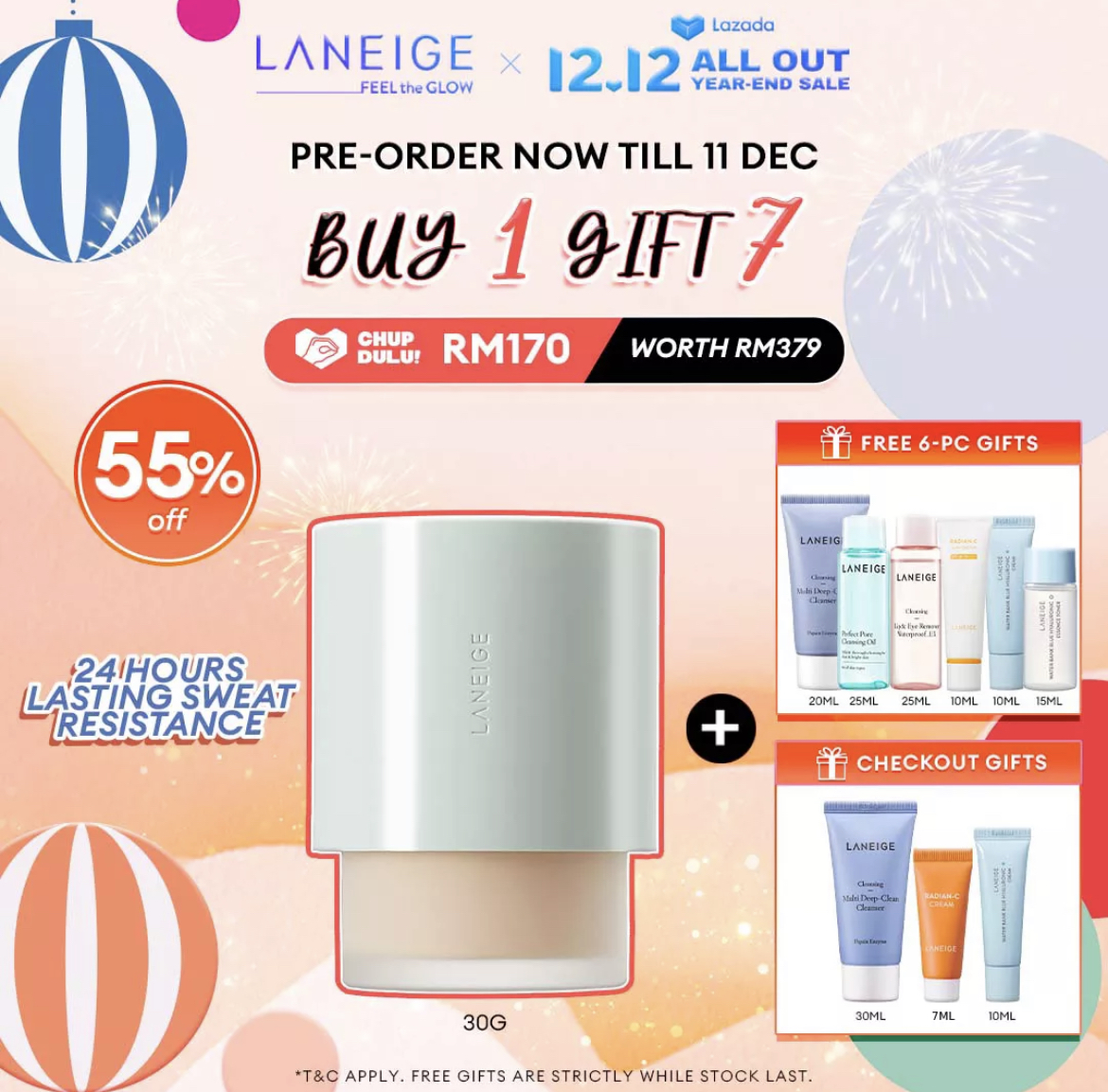 家里的护肤品快要用完了?是时候补货啦~知名品牌 Laneige 举办 12.12 Chup Dulu 预购大促销,折扣高达63%!超值得!