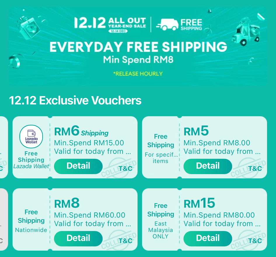 12.12期间除了使用 Lazada 优惠券,还可以加上商家折扣券、免运券及 Lazada Bonus,折扣再折扣!