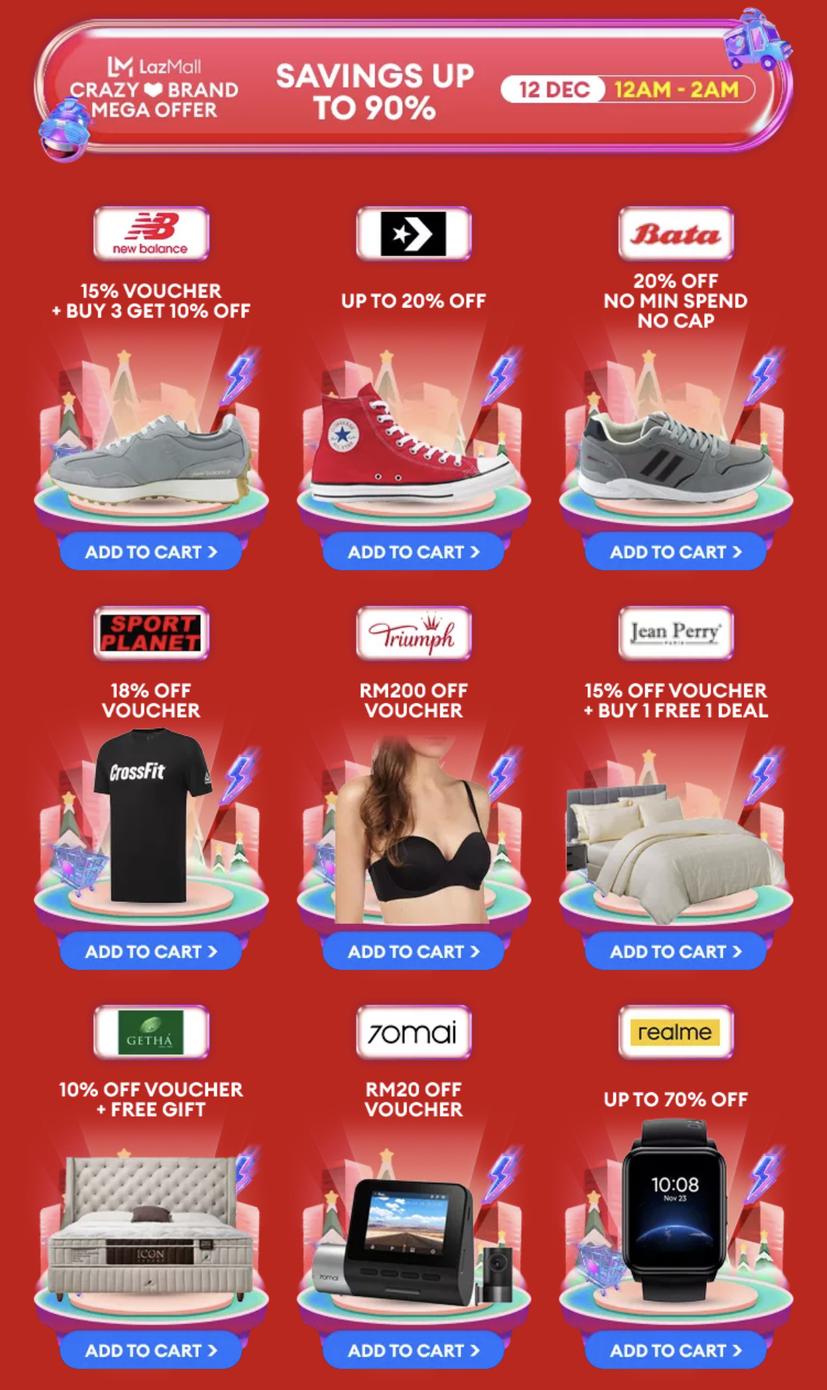 12月12日凌晨12点至2点还会有很多惊喜!许多商家将推出特别优惠,敬请留意 Brand Mega Offer 页面。