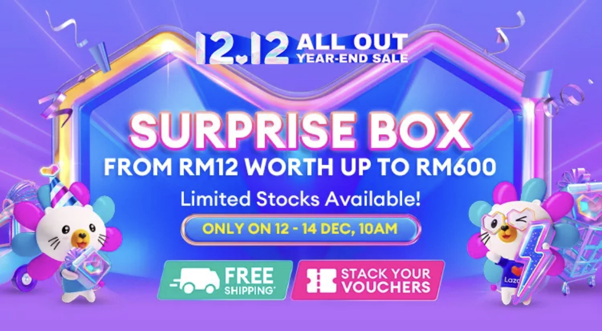 Lazada 惊喜礼盒最低只需RM12,价值高达RM600!12月12日至14日连三天早上10点推出该优惠活动,记得抢购咯~