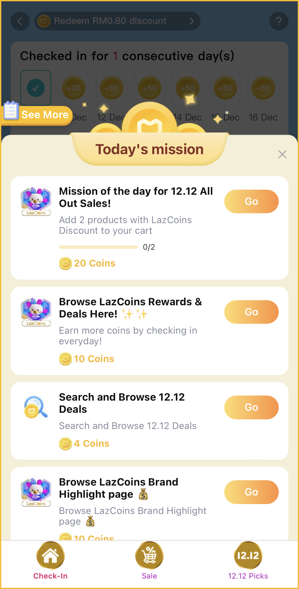 ▼ 可通过完成小任务以赚取更多 LazCoins。
