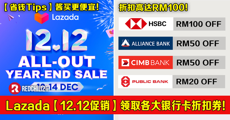 Lazada【12.12大促销】省钱小贴士!领取各大银行卡折扣优惠券!折扣高达RM100!