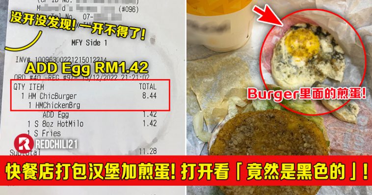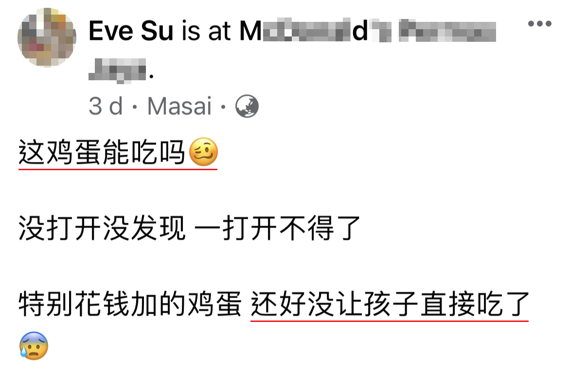这位大马妈咪近日在连锁快餐店打包一份汉堡套餐给孩子,没打开都没发现,汉堡加点的煎鸡蛋竟然是这个颜色的?!