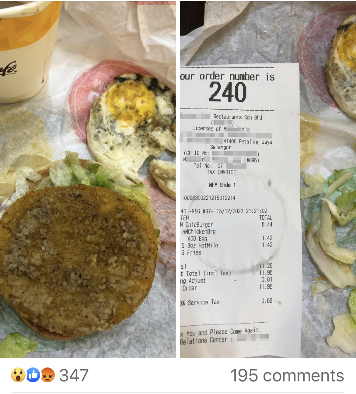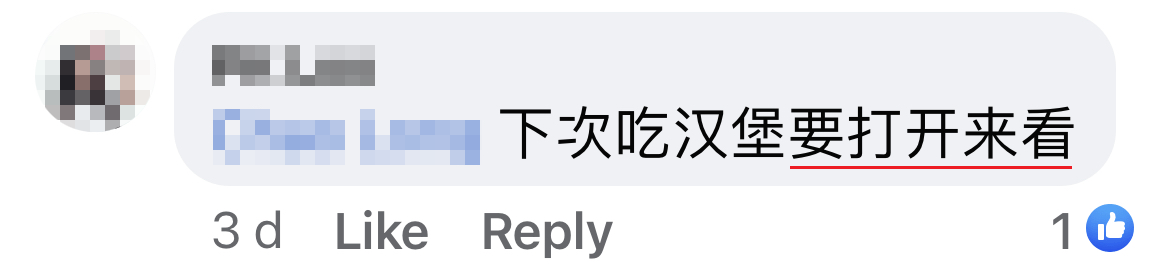 据《中国报》报道,事主透露她是在回到家以后才发现打包的汉堡有问题,因此没有及时向店员投诉。