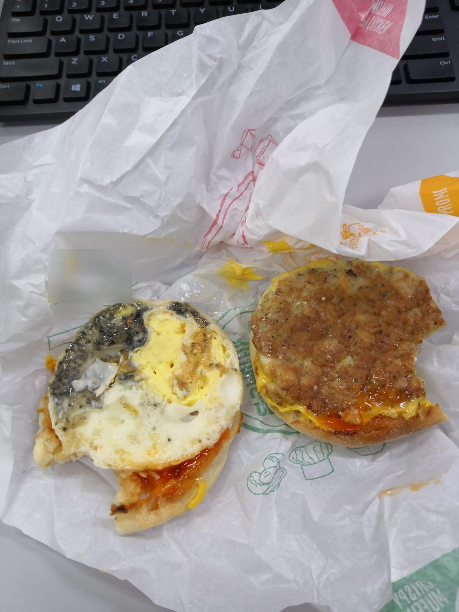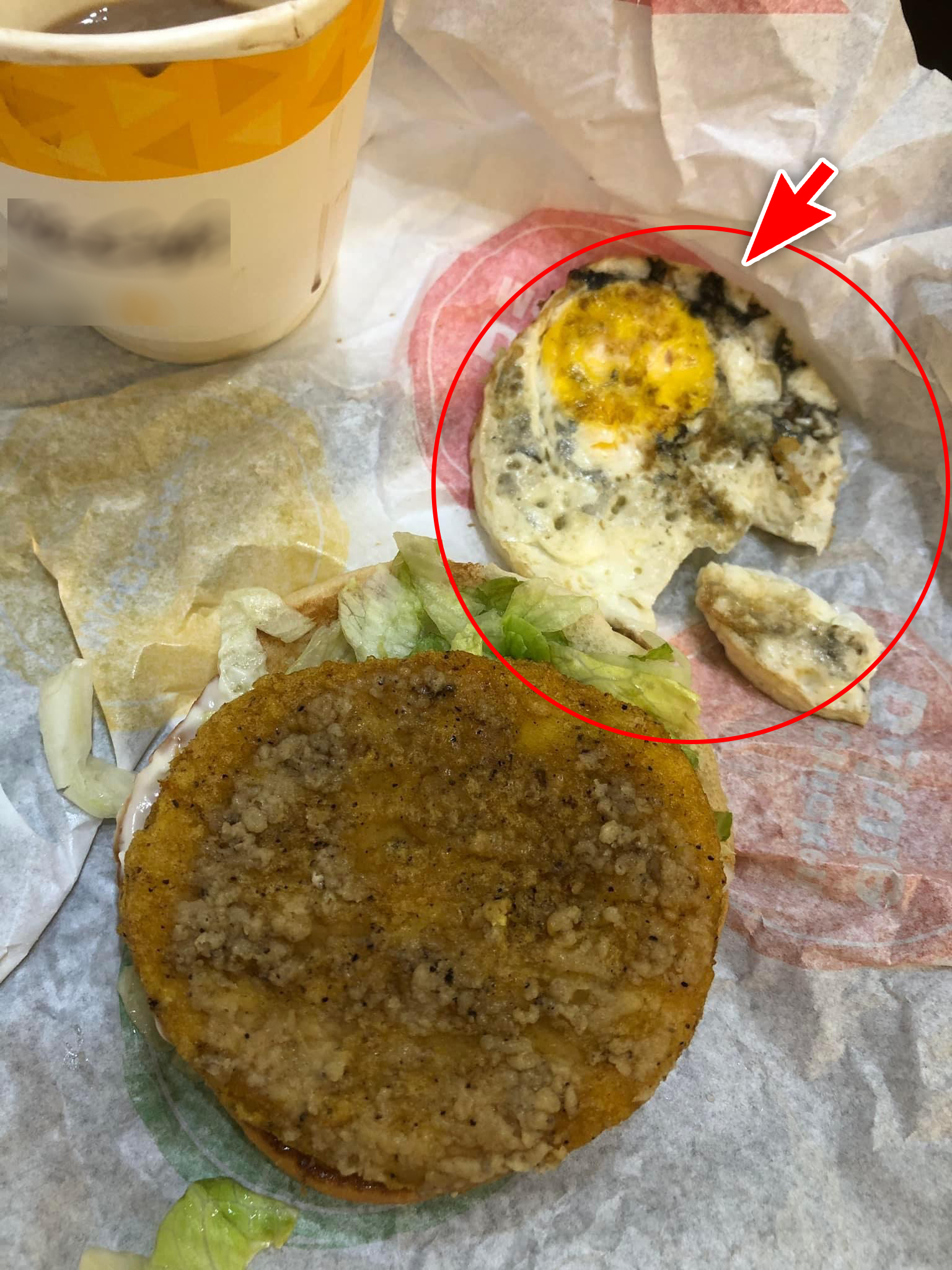 ▼ 结果汉堡打开看,发现加点的煎鸡蛋竟然出现明显的黑状!
