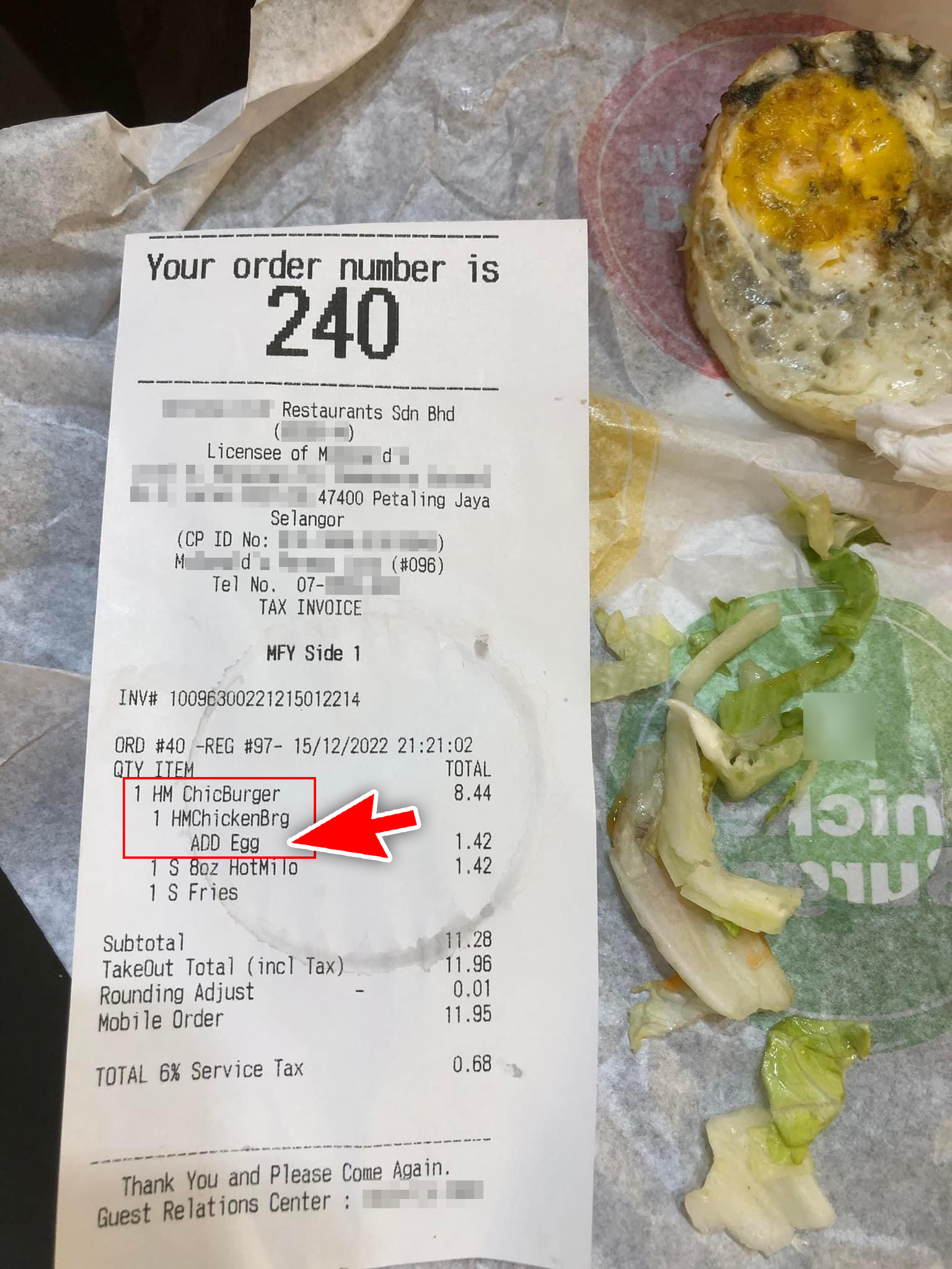 ▼ 从事主的单据可以看到,当天她只买了一份鸡肉汉堡套餐,除了套餐附有的炸薯条和加点的一杯热饮,事主还给鸡肉汉堡 Add-on 煎鸡蛋,价格是RM1.42,这一份快餐总共付了RM11.95。