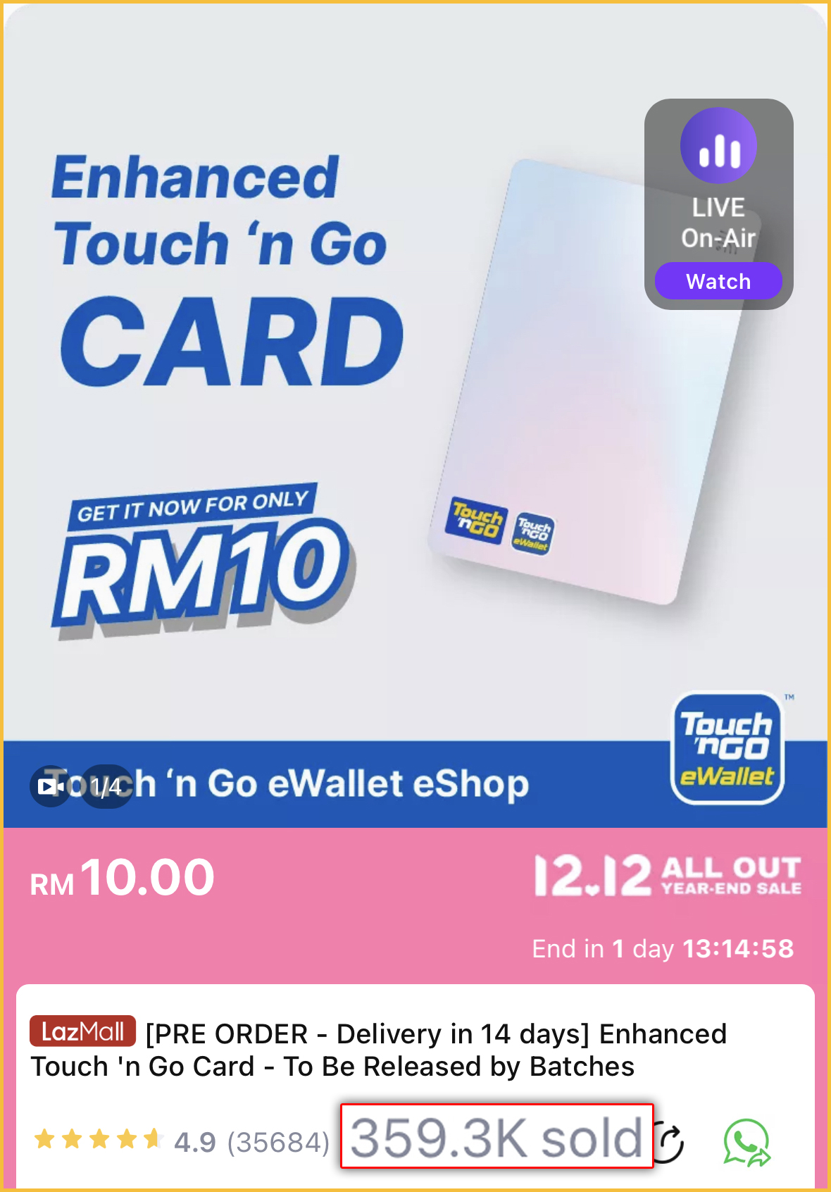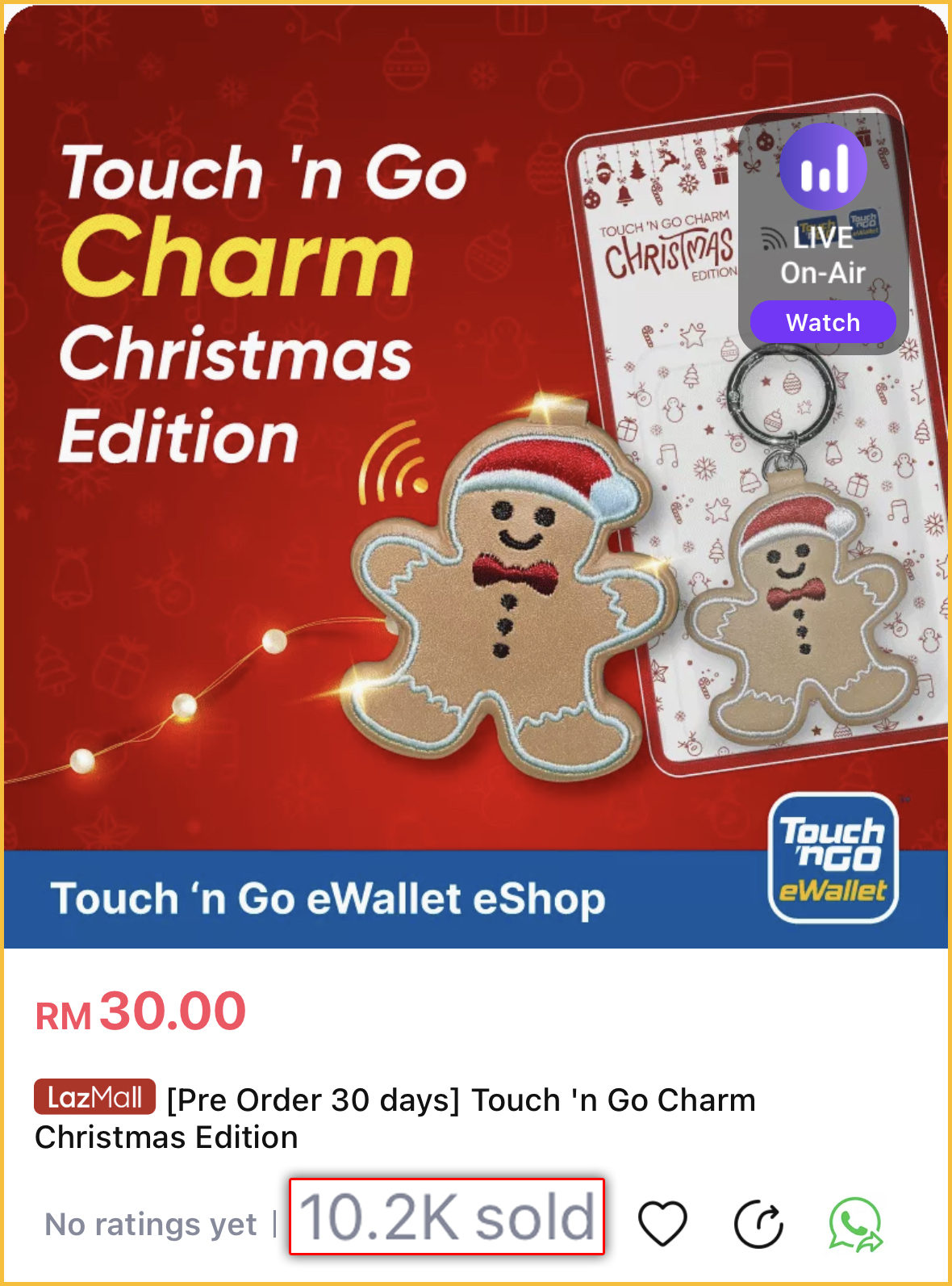 12月12日当天,Touch ‘n Go eWallet x LazMall 旗舰店开售3款热销预购商品,其中包括RFID、NFC卡及姜饼人钥匙圈!而限量版钥匙圈的销量最为惊人,一天内破5位数!