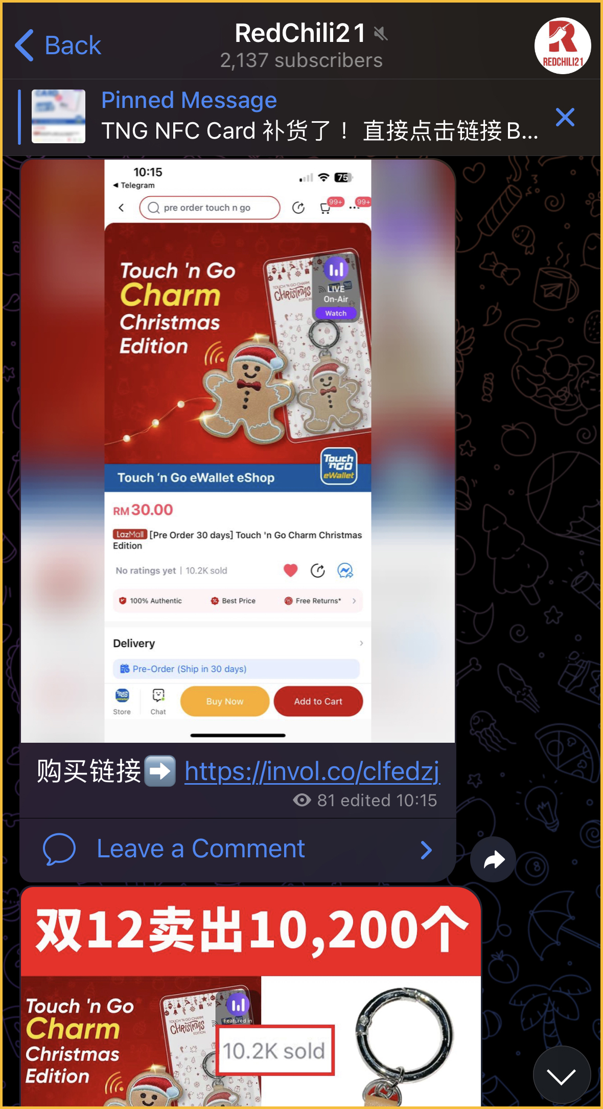 订阅 RedChili21 Telegram !无论是 NFC 卡或限量版钥匙圈,我们都会随时更新 TNG 官方的最新补货消息,让你第一时间点击抢购!