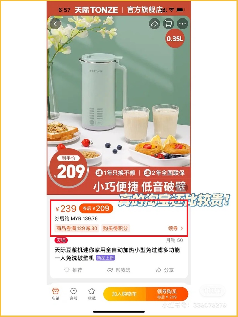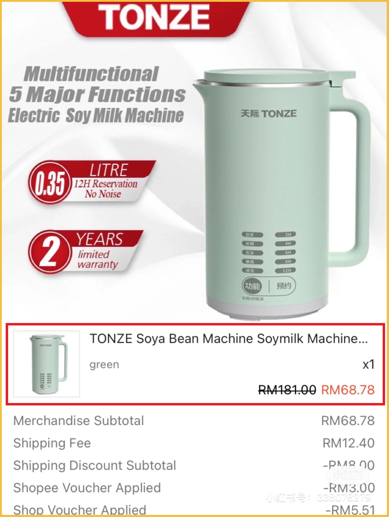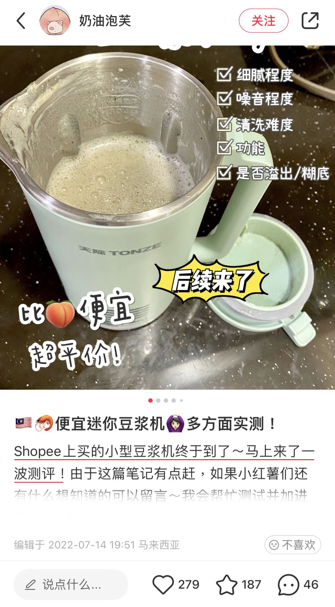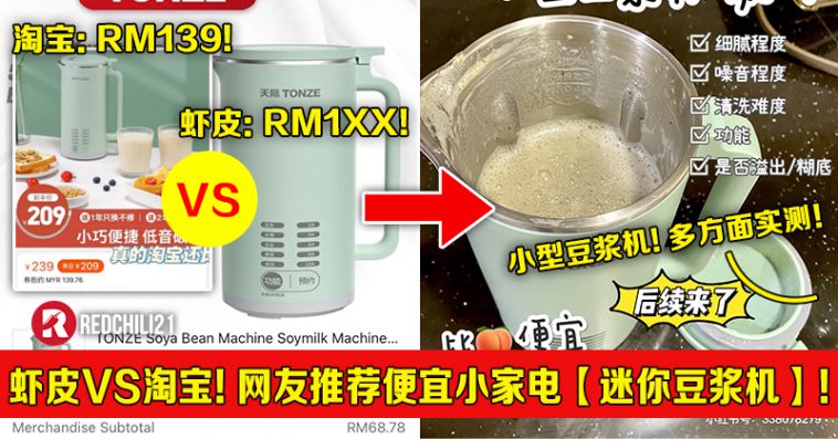 大马买家在小红书分享自己的网购经验,对比淘宝网以后竟发现 Shopee 入手平价豆浆机更便宜!实测后的使用心得7大重点!