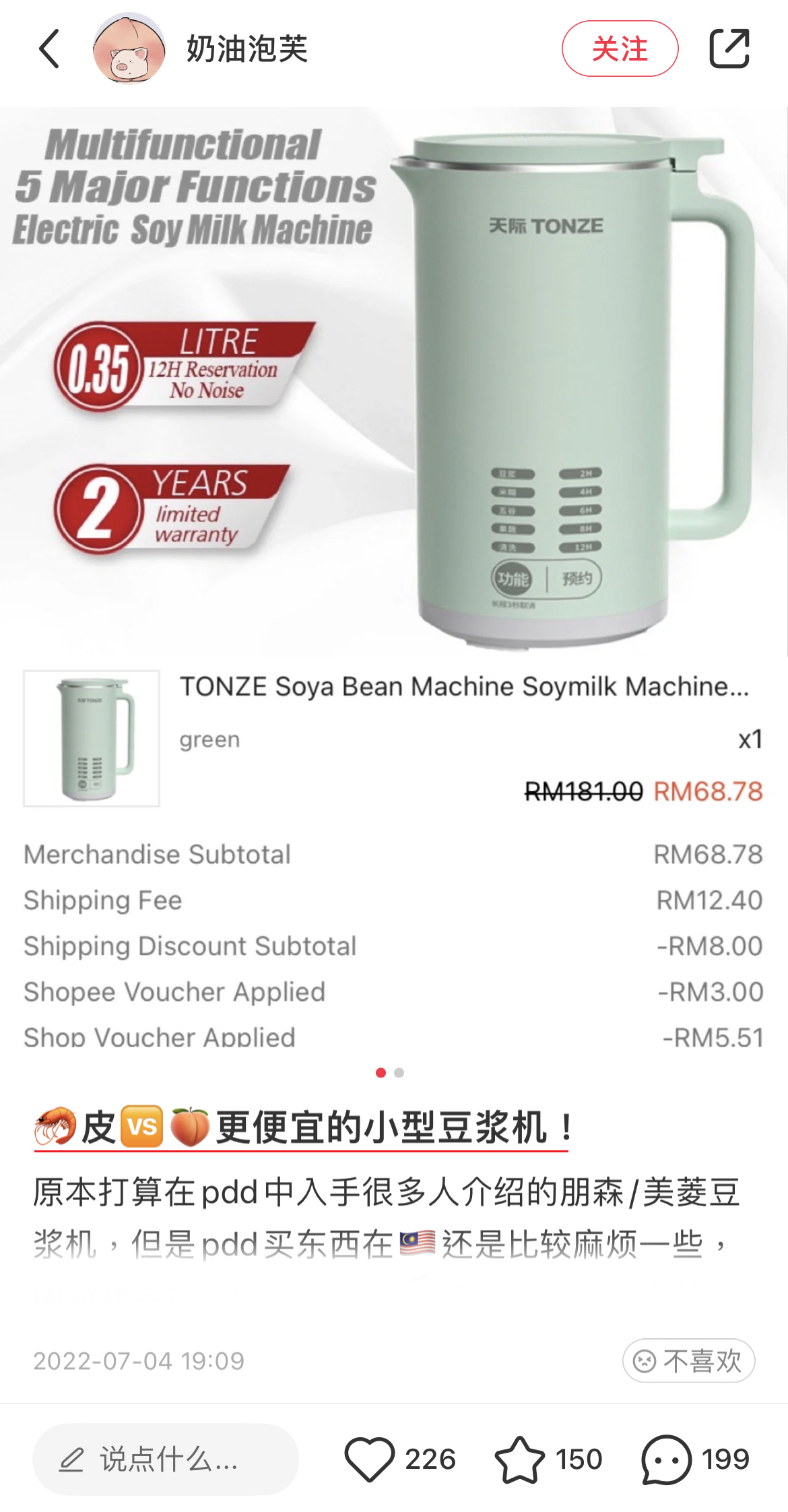 然后寻思着买瑞本的小型豆浆机也不错,起码虾皮的价钱和 pdd /淘宝不会贵得太离谱,差不多贵个RM10-20,这我绝对可以接受。
