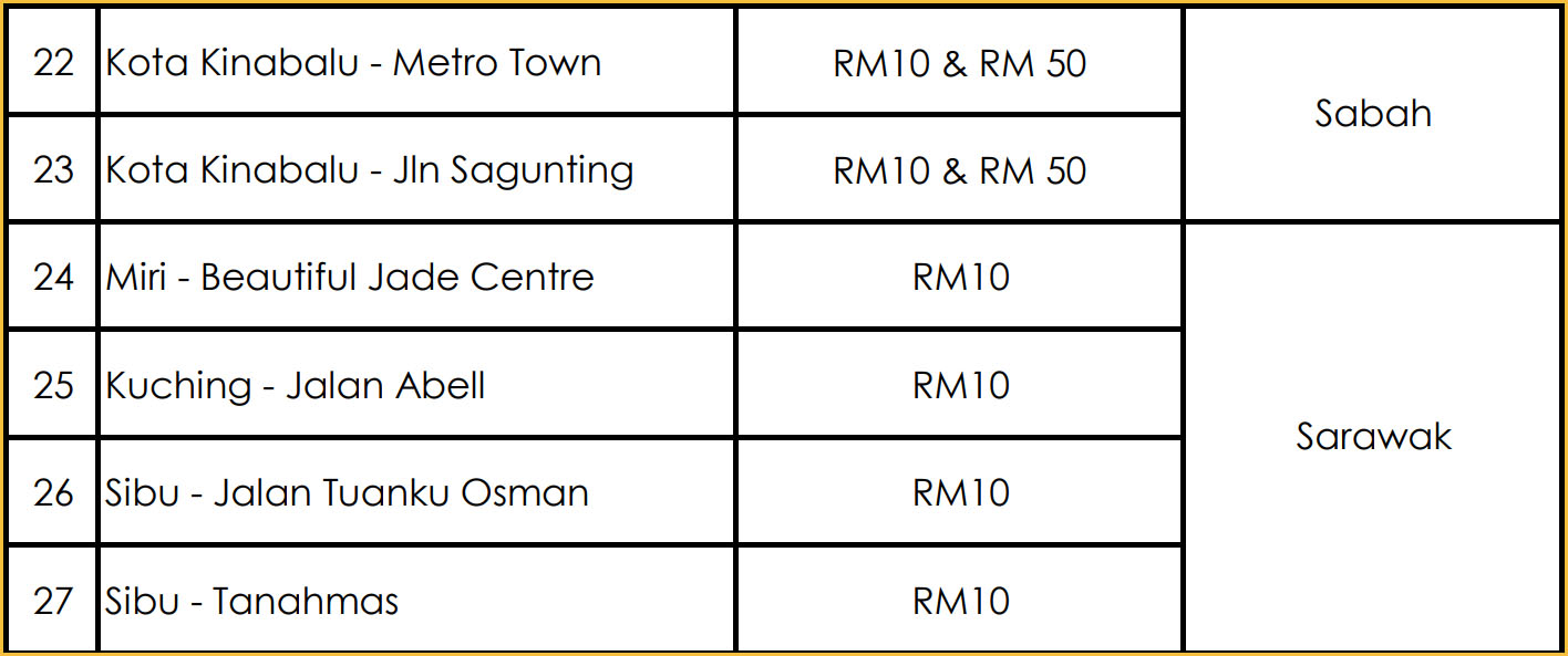 ▼  提供新钞票的27处指定 AmBank ATM 分行及地点: