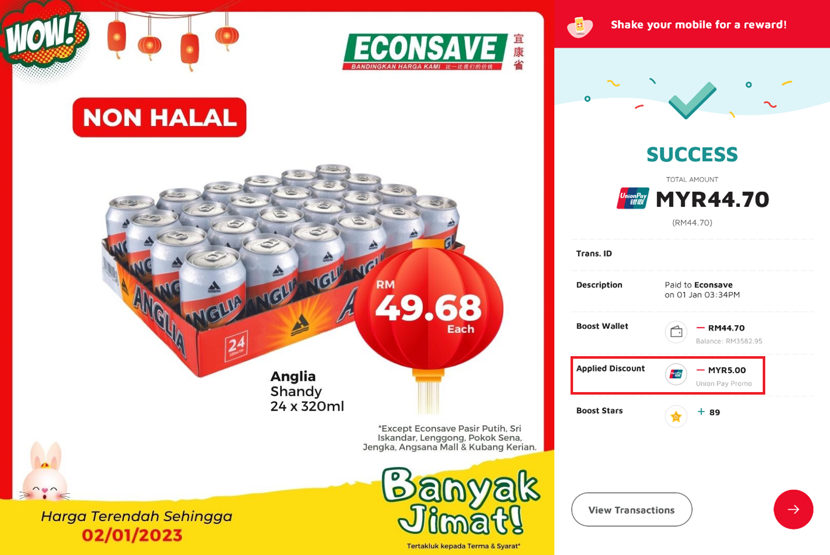 ▼现在只要在Econsave 使用Boost Unionpay 消费RM25 以上就能得到即时回扣(instant cashback) RM5!
