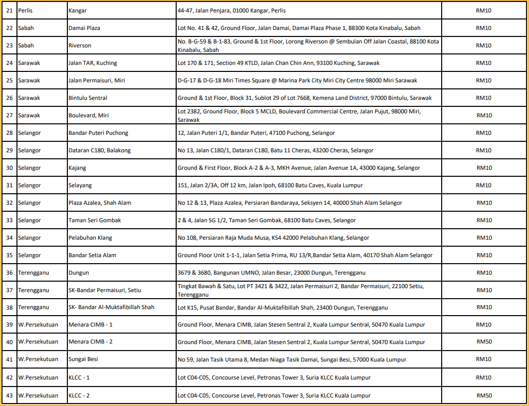 需注意的是,大部分 ATM 分行只提供RM10 新钞票,而只有2家分行提供RM50 新钞票,分别是吉隆坡Menara CIMB及KLCC-2。
