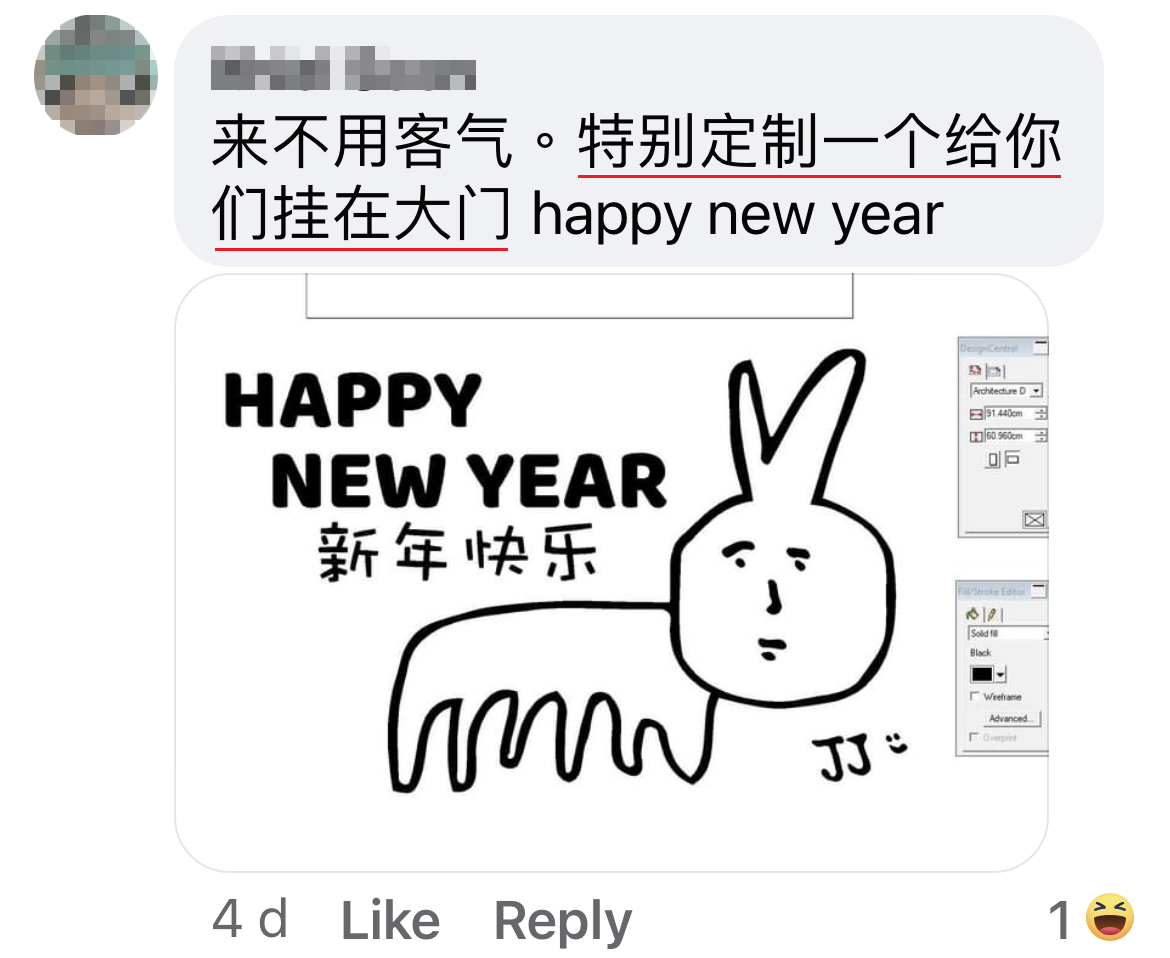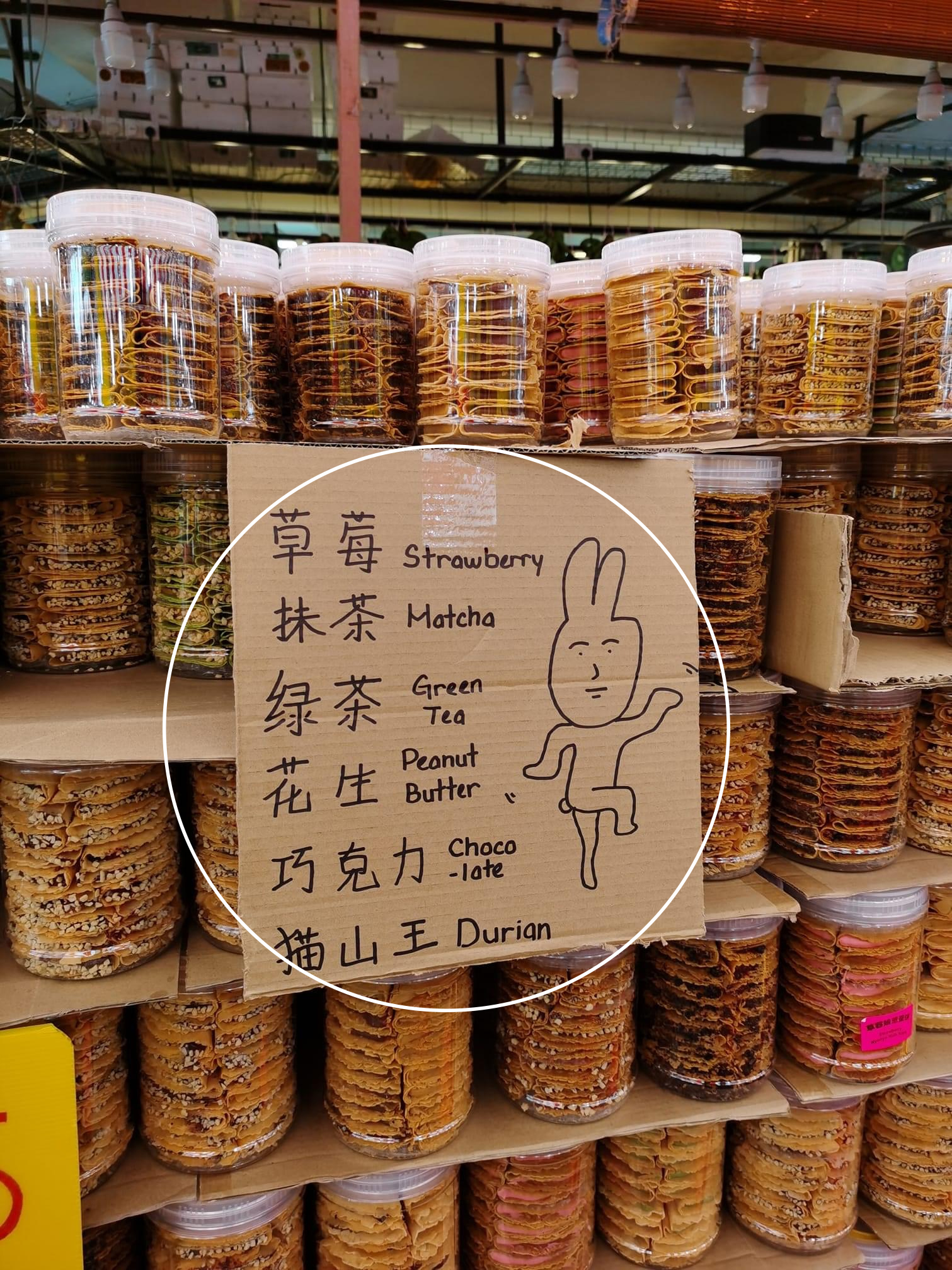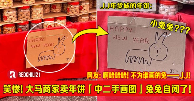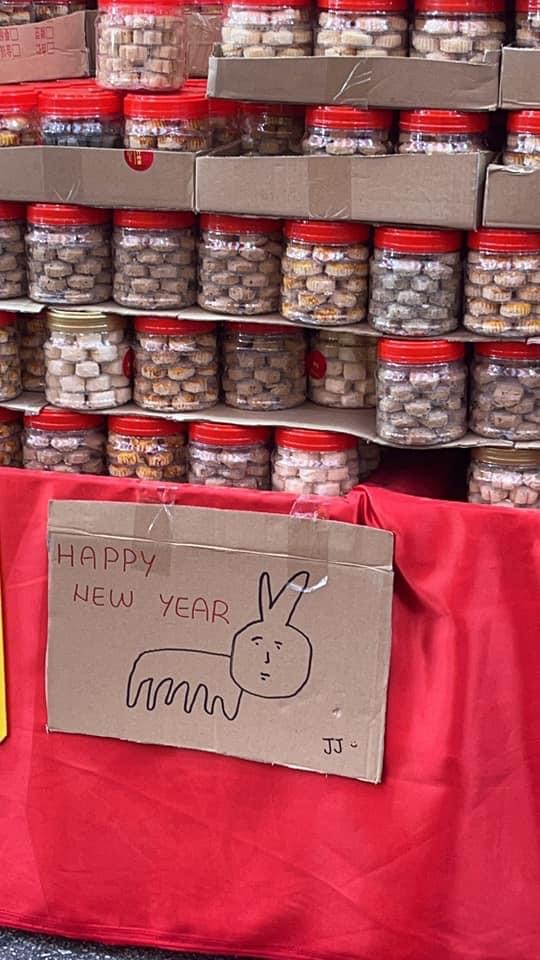 ▼ 兔年新年快乐!卖家用纸皮画了简单的图案挂在摆满年饼的摊位,除了写着“Happy New Year”最引人注意的就是“小兔子”——中二的表情加上6只小脚。(兔子什么时候多了2只脚??