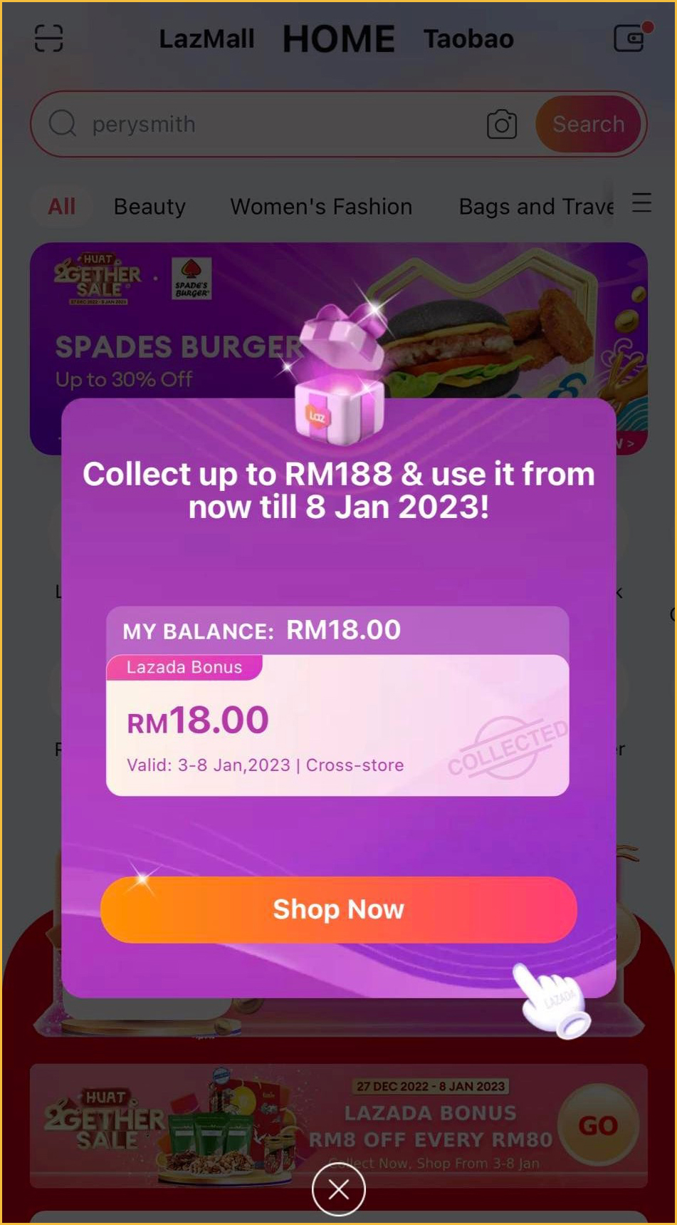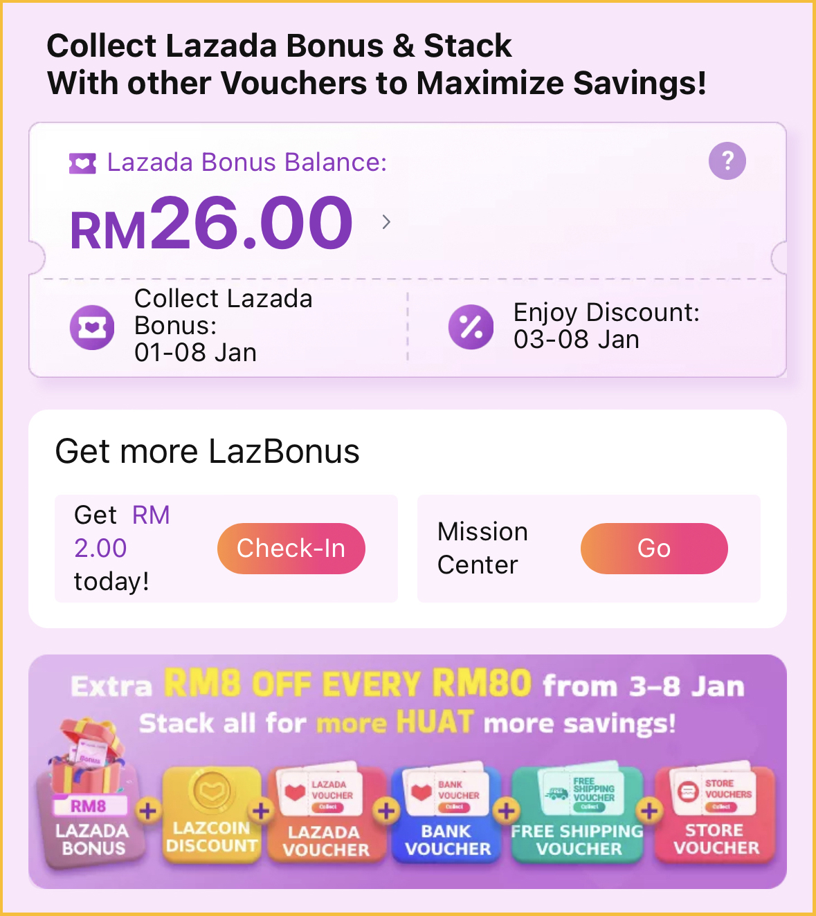 即日起至1月8日,通过 Lazada App 每日领取 Lazada Bonus 奖励!每消费RM80 可折扣RM8!买的越多折扣越多~