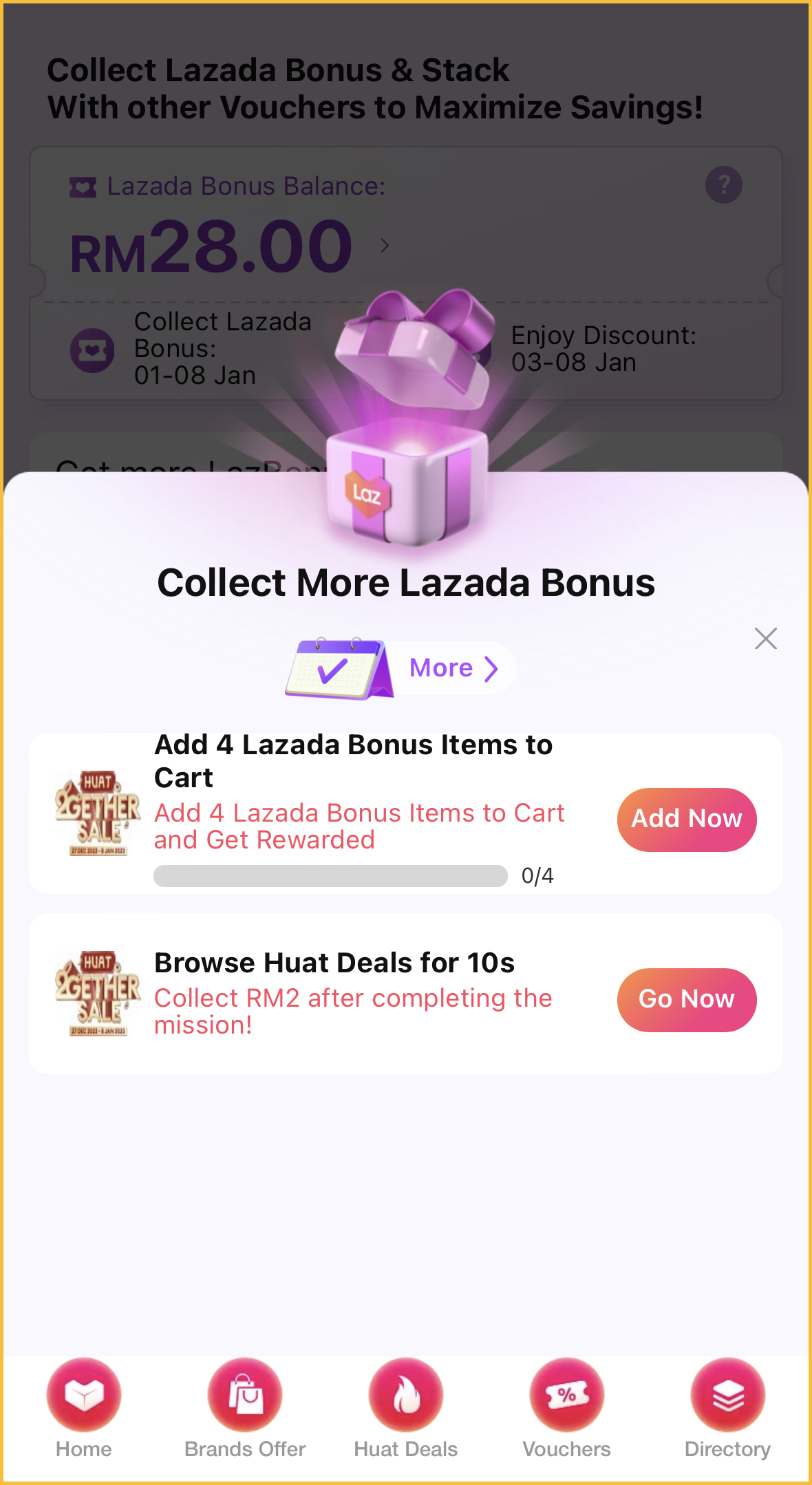 ▼ 在 “Mission Centre” 完成小任务也可以获得额外RM4!任务分别是:把4个 Lazada Bonus 商品加入购物车,完成后可获RM2。浏览“Huat Deals”页面10秒再获RM2!