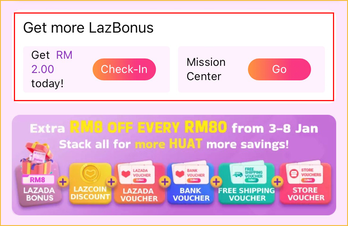 ▼ 此外,点击 “Check-In” 还可额外获得RM2 Lazada Bonus!