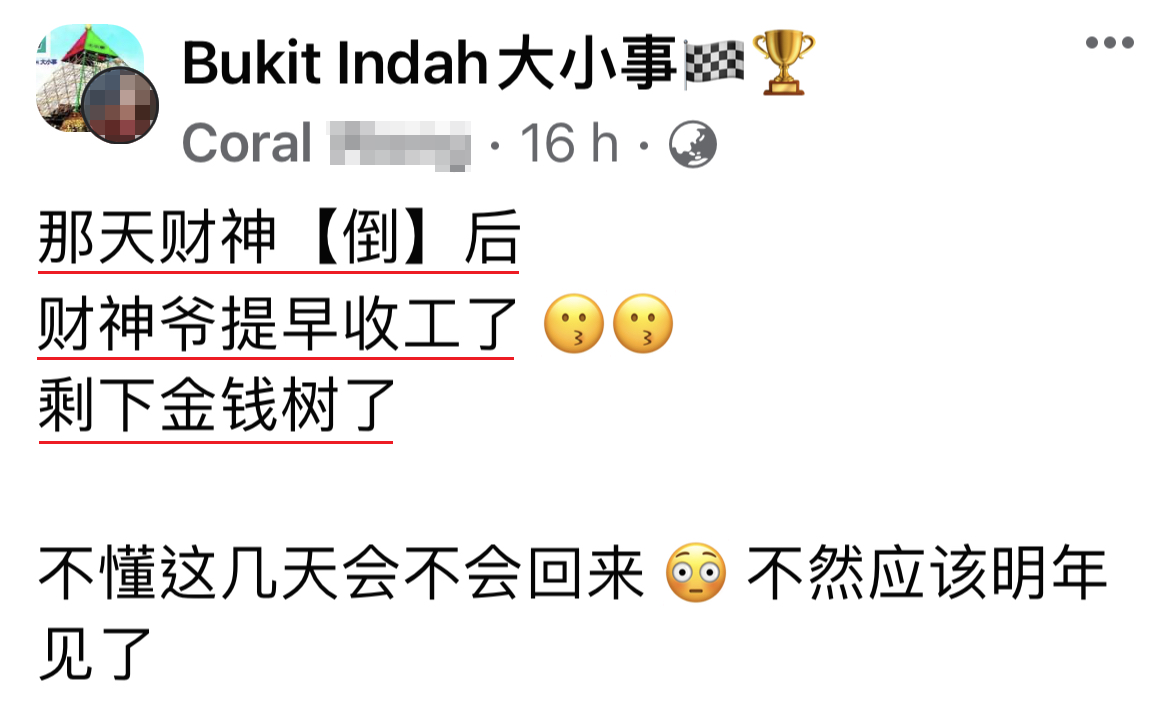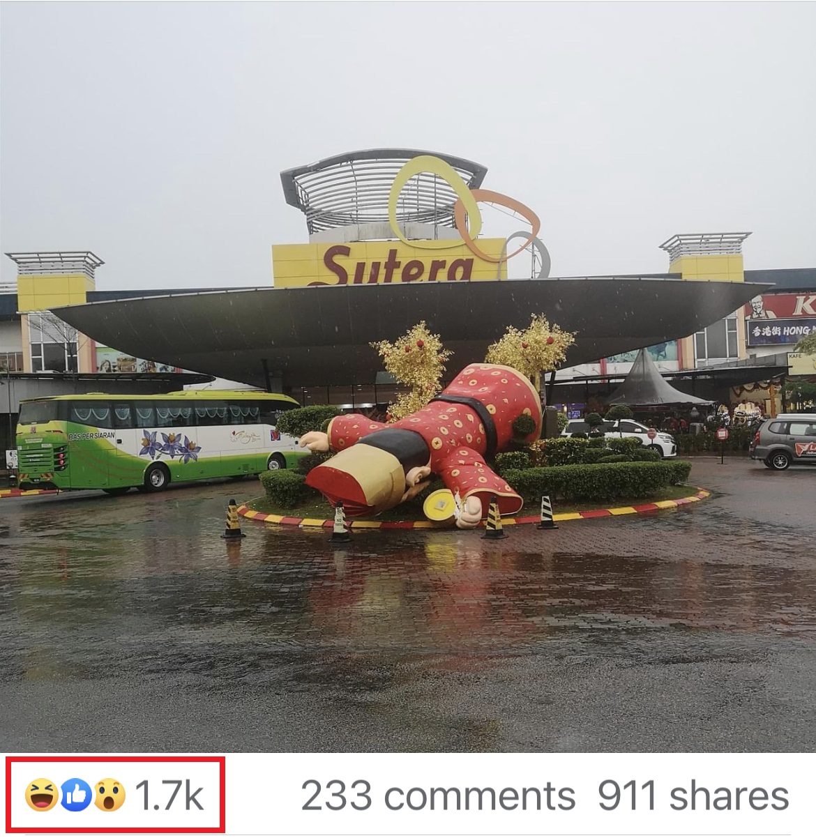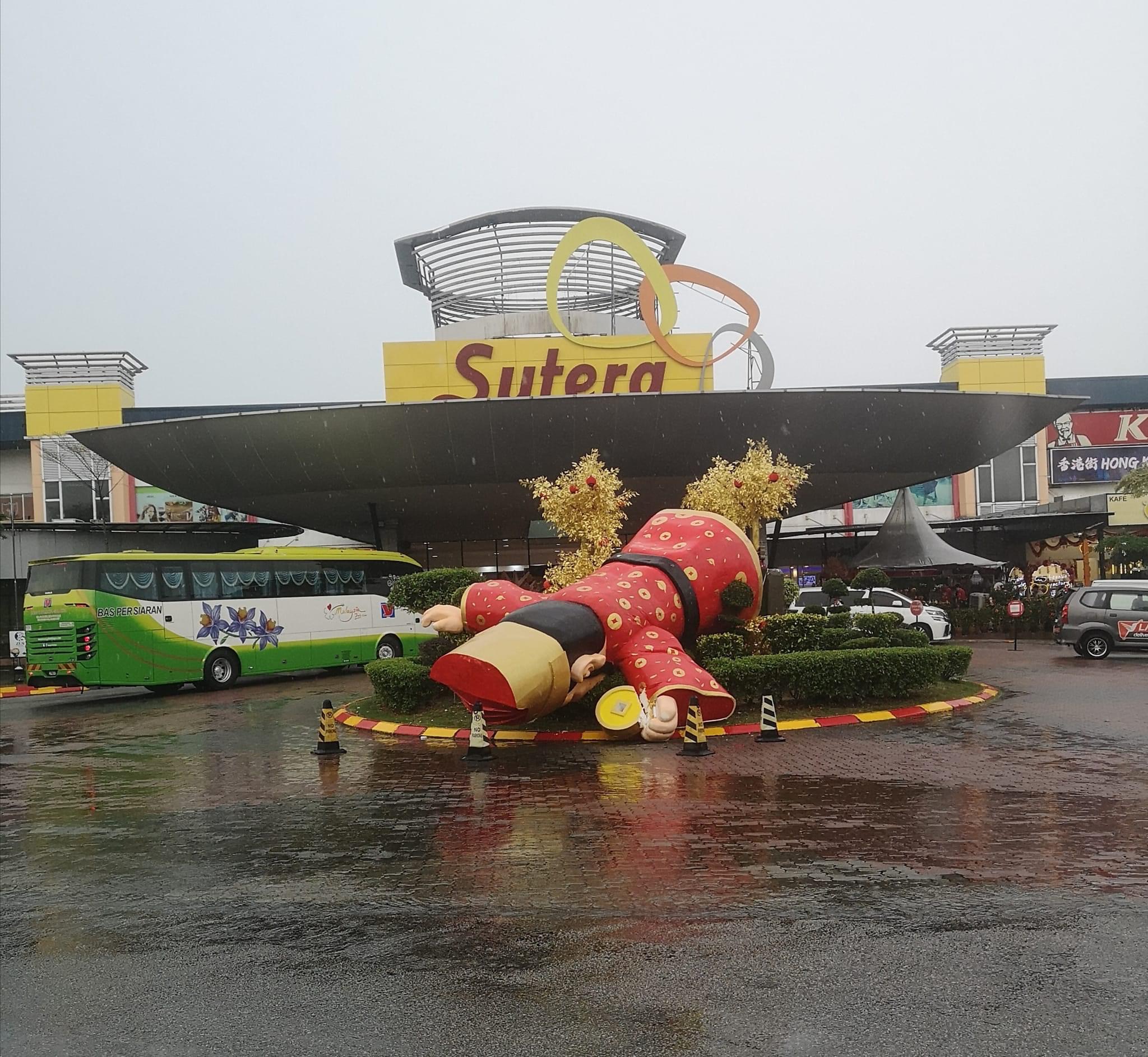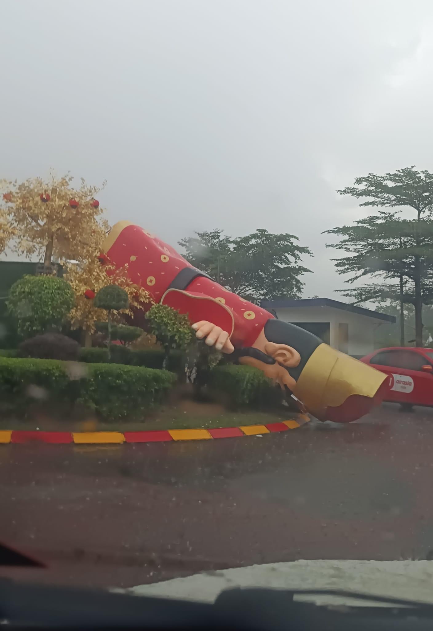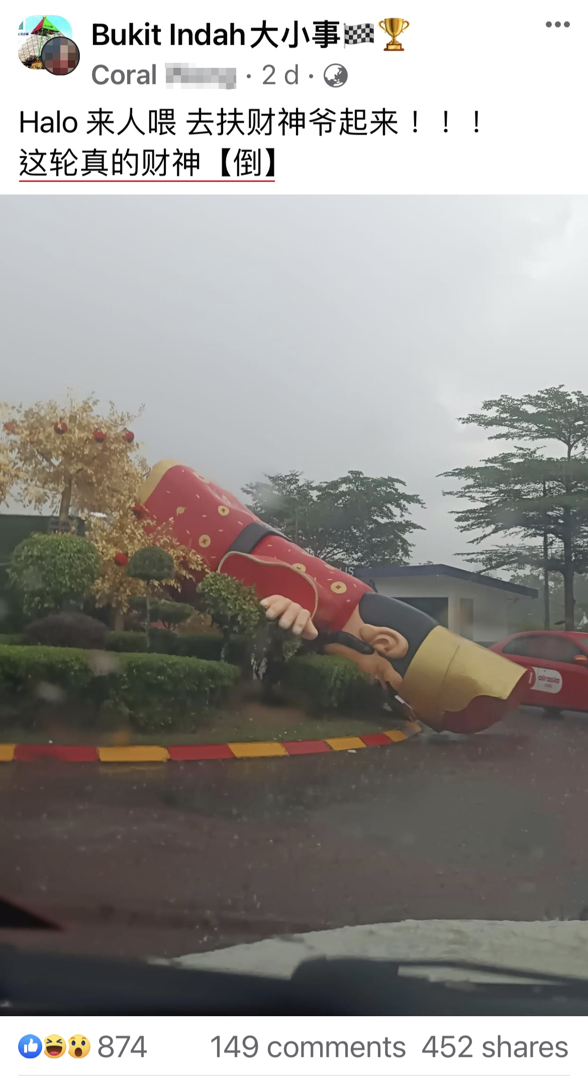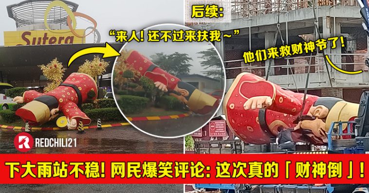 但这个摆设在柔佛 Sutera Mall 外面的巨型财神爷,近日因为一场大雨意外被吹倒,被迫提早下班。网友们幽默评论“这次真的是财神倒”!
