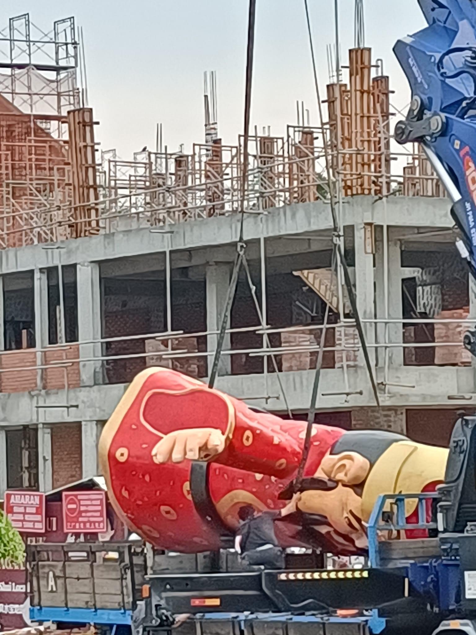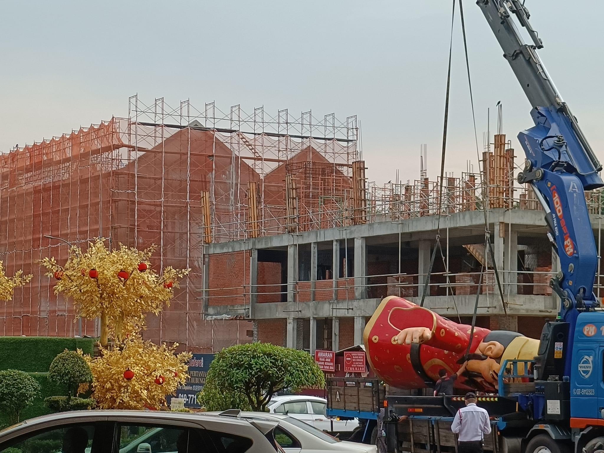 ▼ 巨型财神爷就摆在商场前面正中央,13日当天下午一场大雨加上刮大风,财神爷“耐不住”突然应声倒下,随后照片就在社交媒体上疯传,「财神爷请假2天休息」。