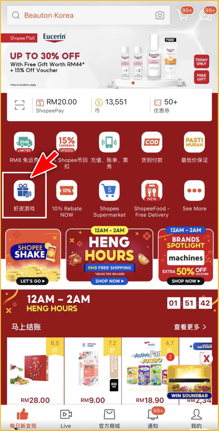 ▼ 步骤 1:打开 Shopee 应用程序,点击“虾皮游戏”。