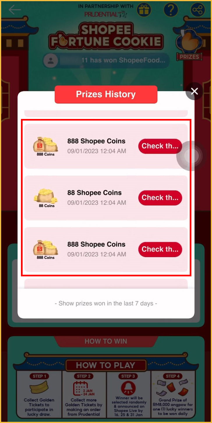 Shopee Fortune Cookie 拿到了14次的 888 coins,再加上 88 coins,100 coins,8 coins……