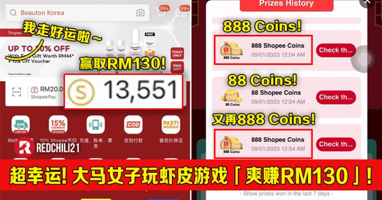 1月9日凌晨,这位小姐姐透过小红书晒出自己的战绩,在“虾皮游戏”赢取多达13,611虾皮硬币,也就是RM130!全网表示羡慕惨了!