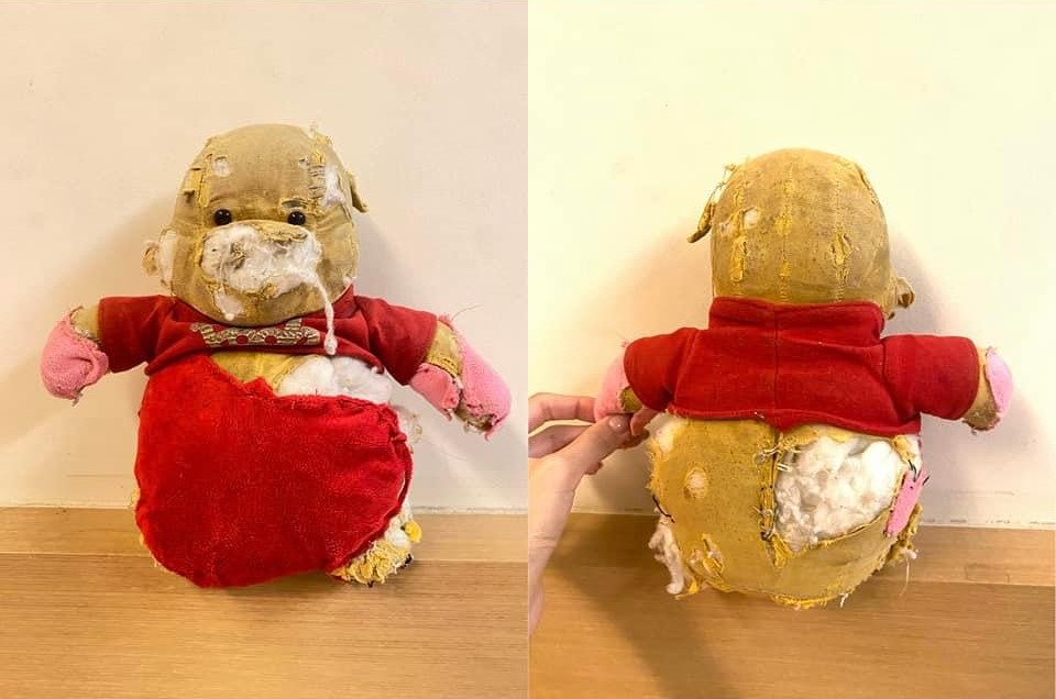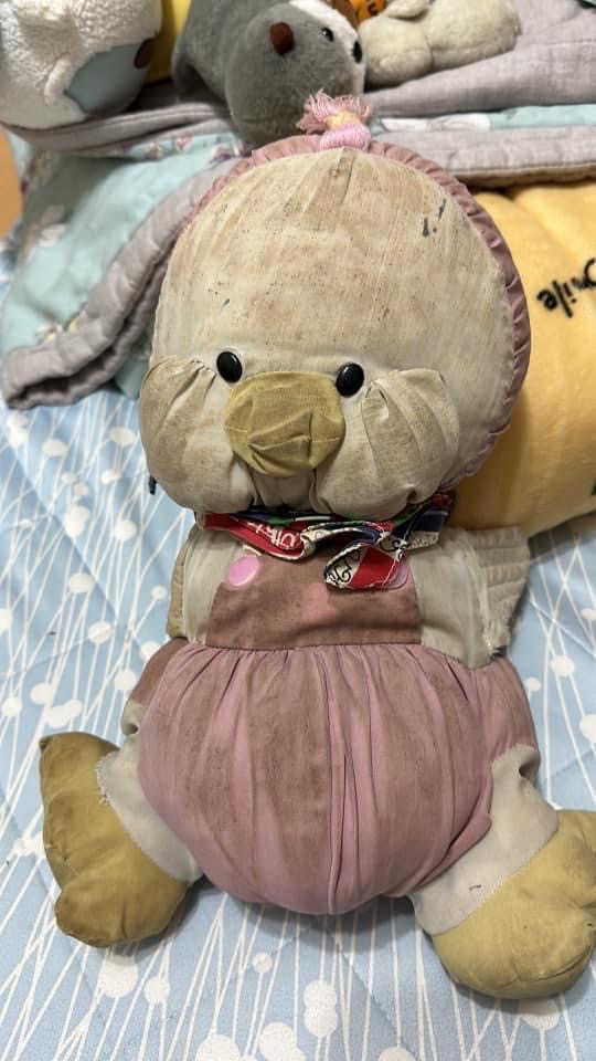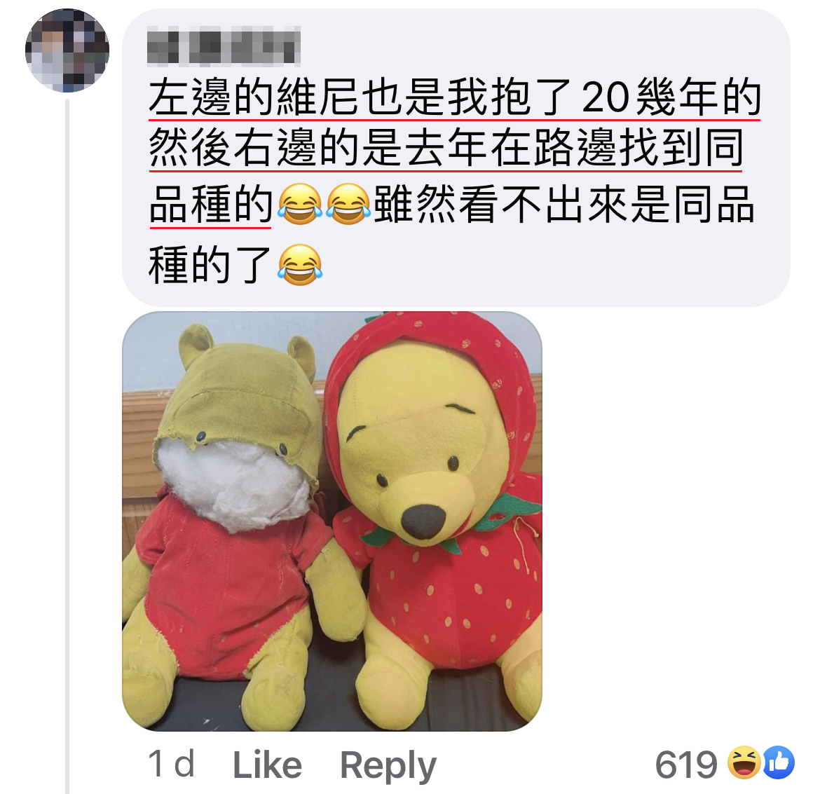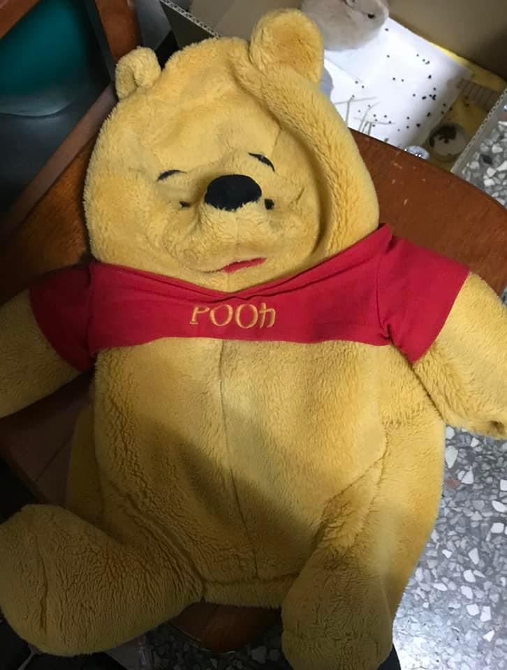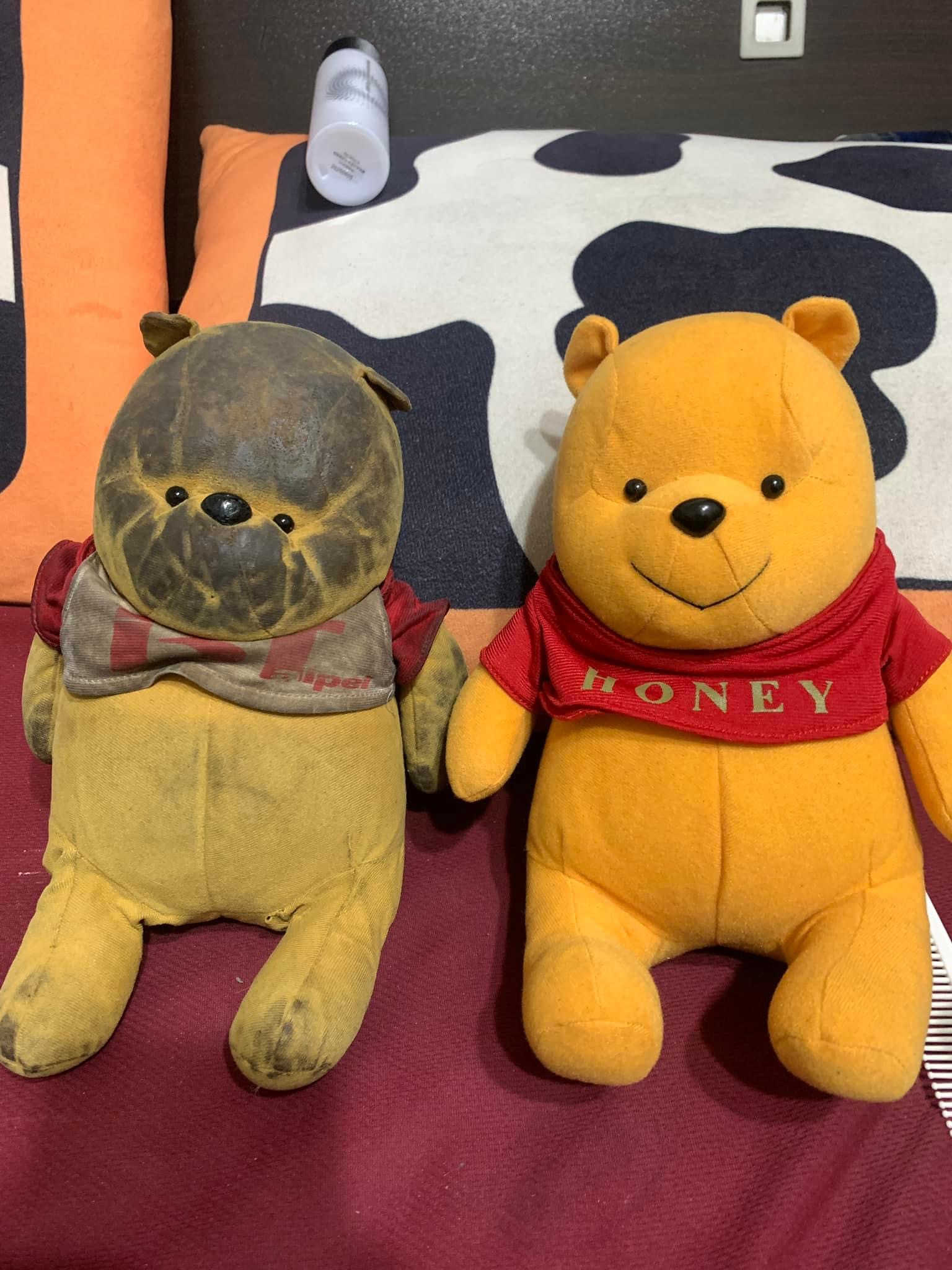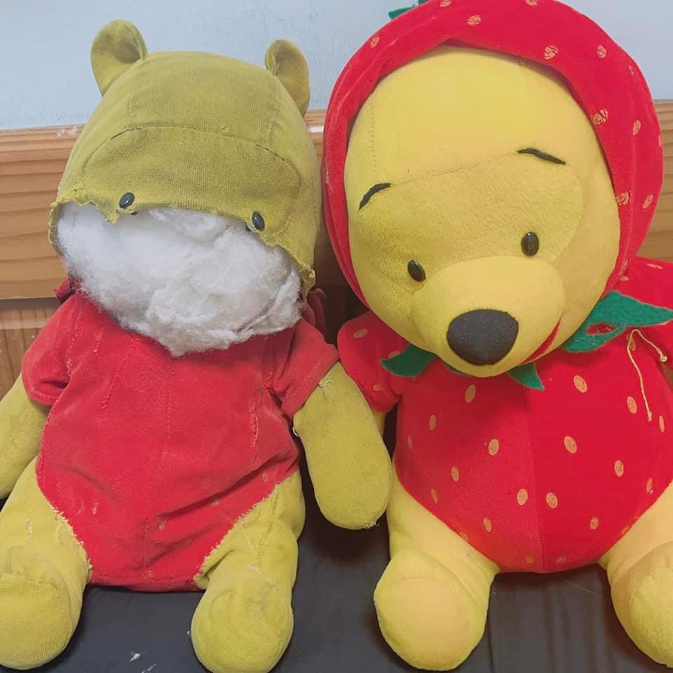 左边那只:我女友抱了20多年的口水维尼,左边白色衣服是別只娃娃身上给他穿过来的。