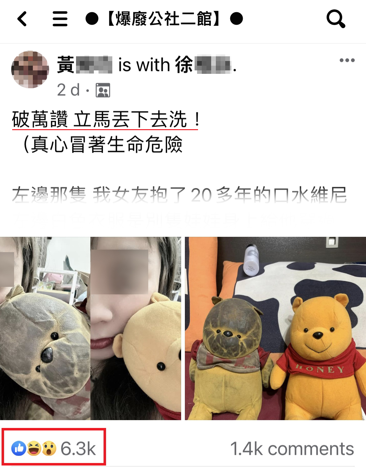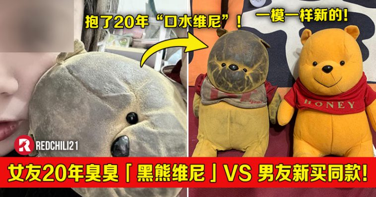 台湾这名网友近日在“爆废公社二馆”分享女友抱了20年的“口水维尼”,原本萌萌哒的“小熊维尼”现在变成了表情无助又无奈的“黑熊”!