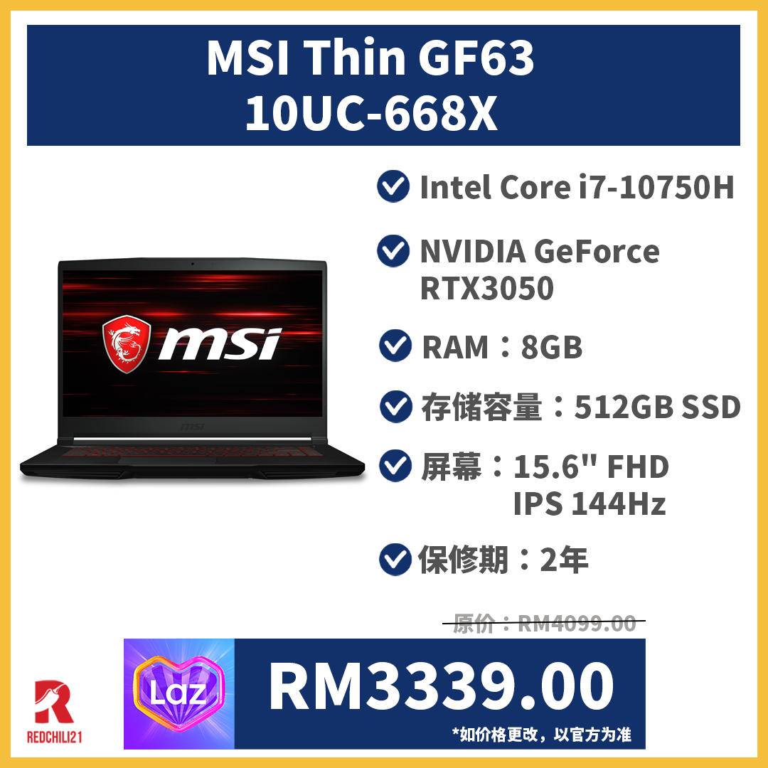 ▪ ⑤ MSI Thin GF63 10UC-668X 游戏笔记本电脑