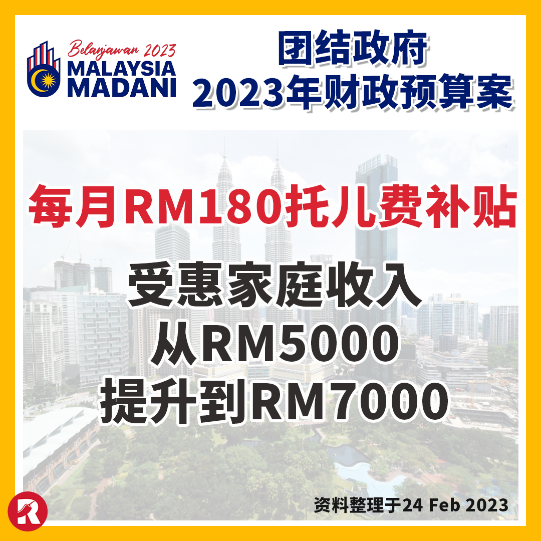 补助金其中也包括托儿费,每月可获RM180。受惠家庭收入可从RM5,000提升至RM7,000。