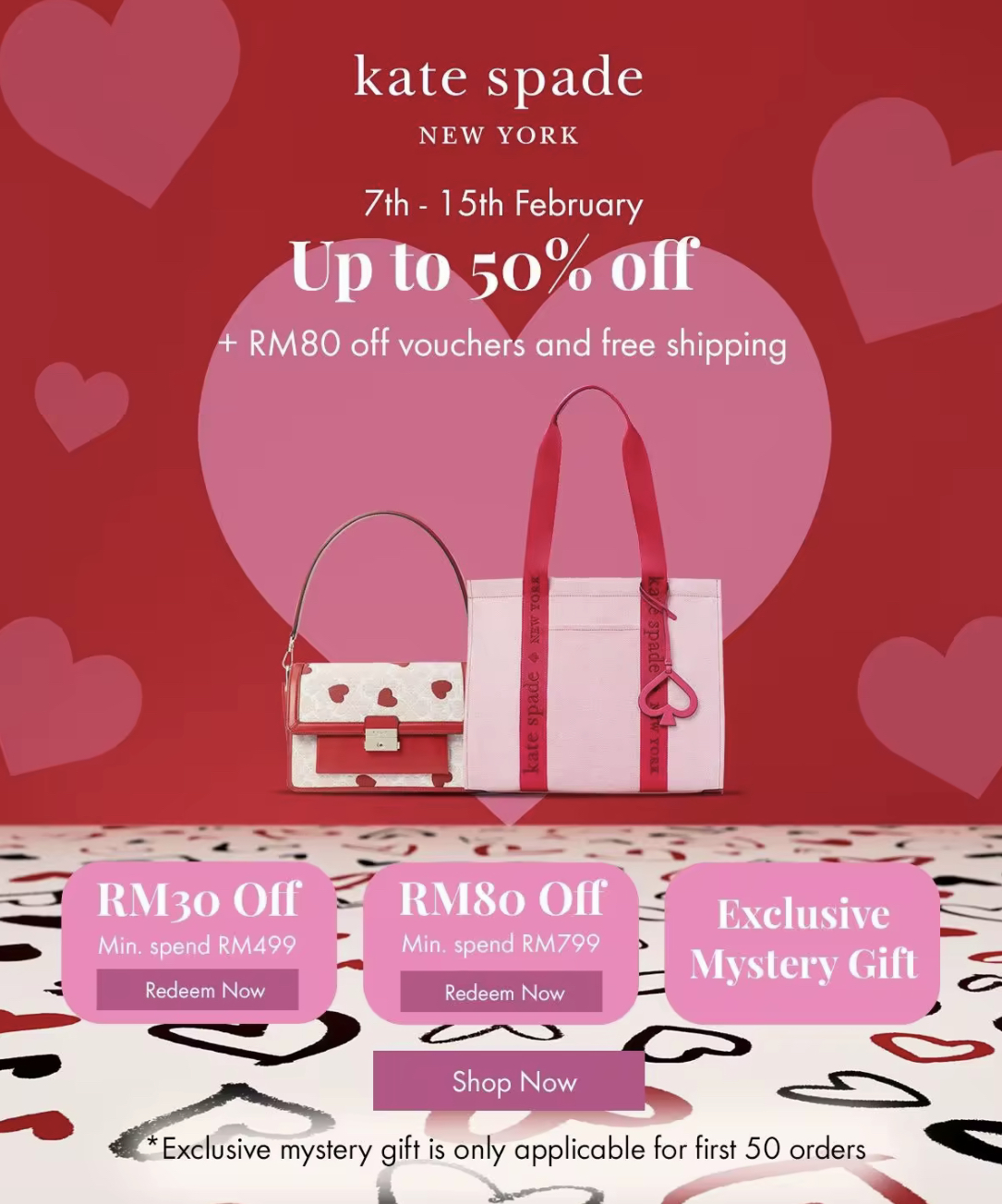 为了配合即将到来的情人节,著名国际时尚品牌 Kate Spade 在 Lazada 旗舰店举办长达1星期特别促销,折扣高达50%!