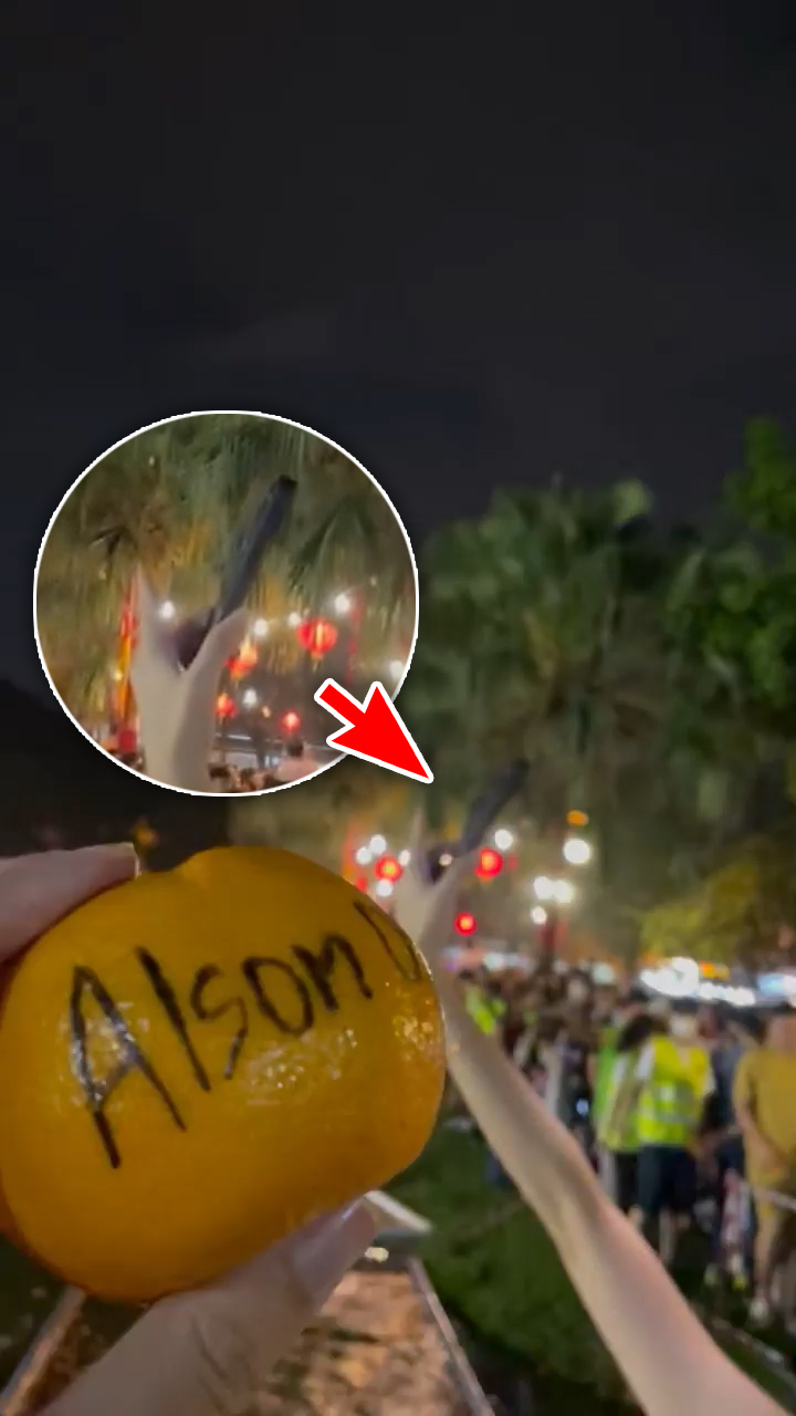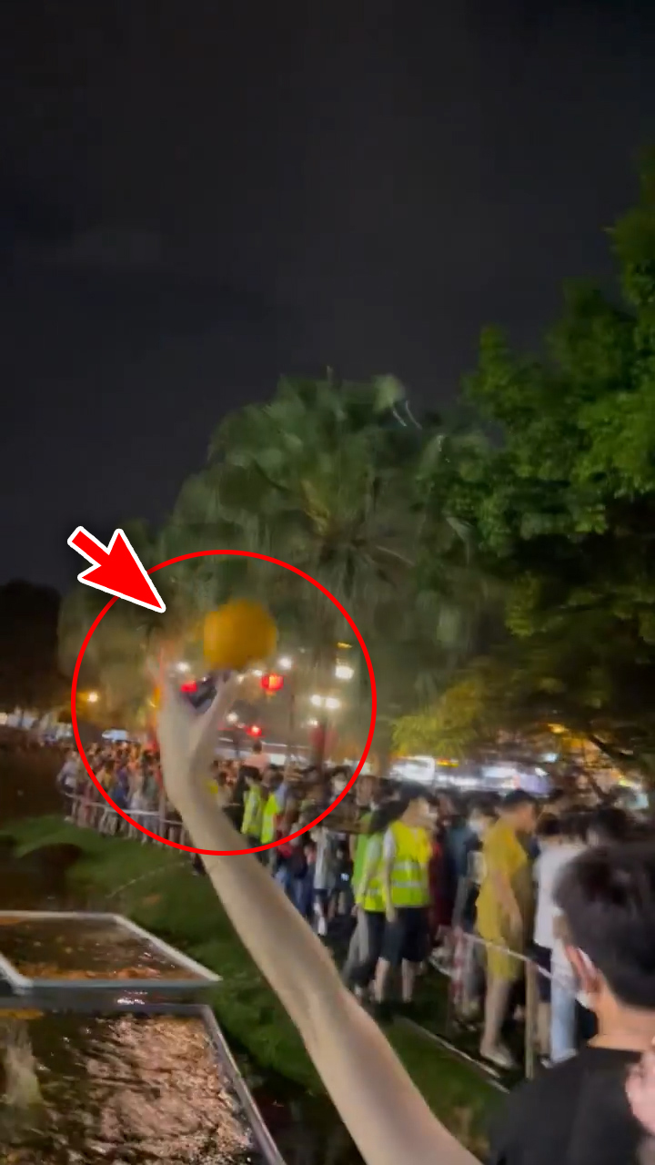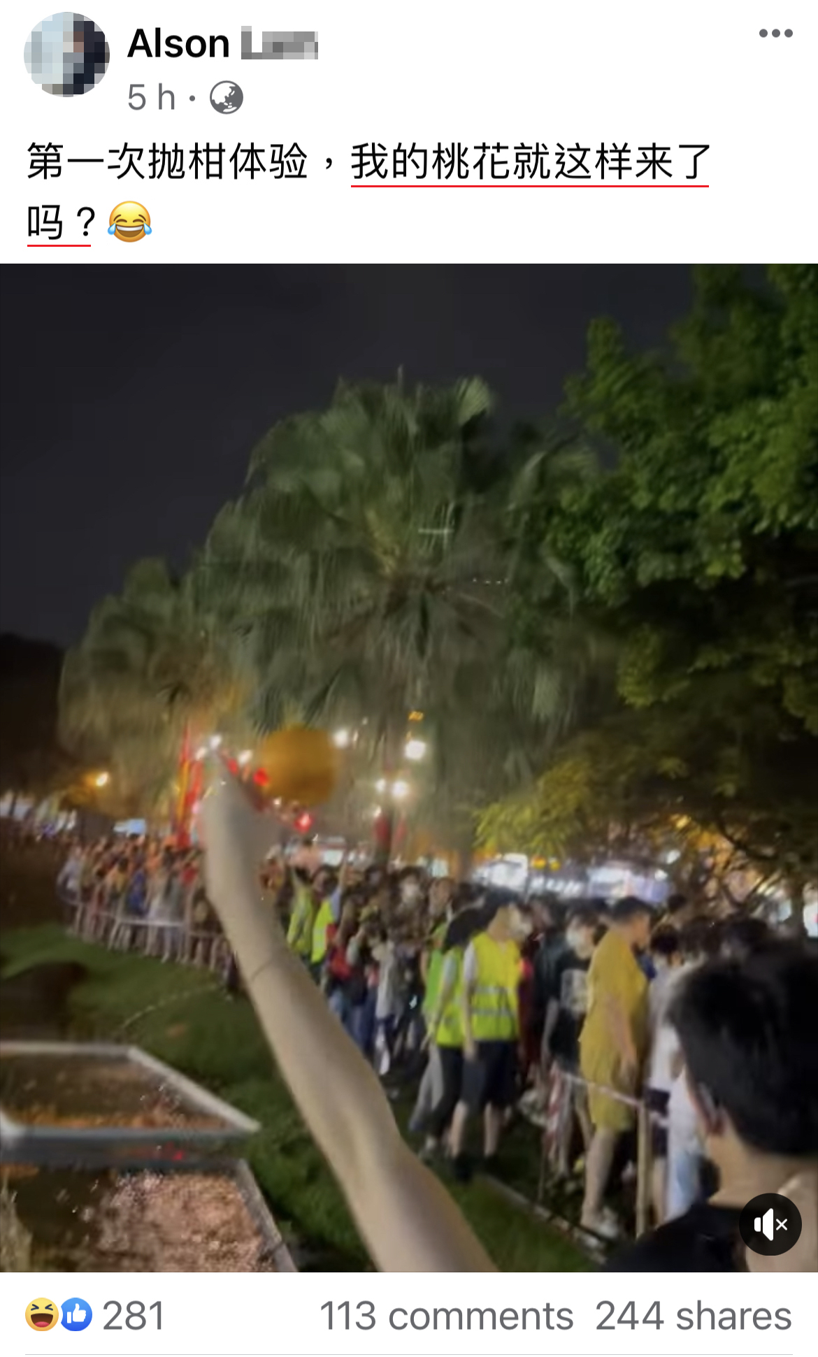 ▼ 元宵节当晚的抛柑活动,该名男子用手机记录下这“难得的一幕”,他拿起写着自己名字的柑,准备往河里丢,想趁机求个好姻缘~