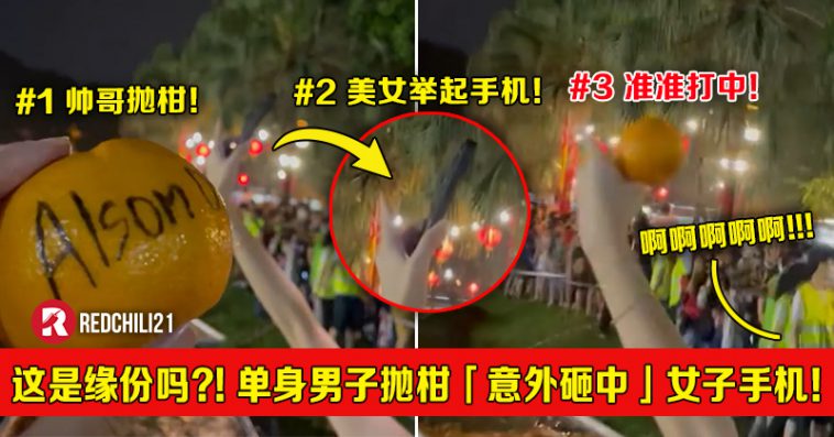 今天一段短视频在社交媒体迅速爆红疯传,一名从事保险经纪的单身男子昨晚去参加元宵节抛柑活动,意外“丢中”一名女子的手机!上一秒还在自拍,下一秒手机就不见了!