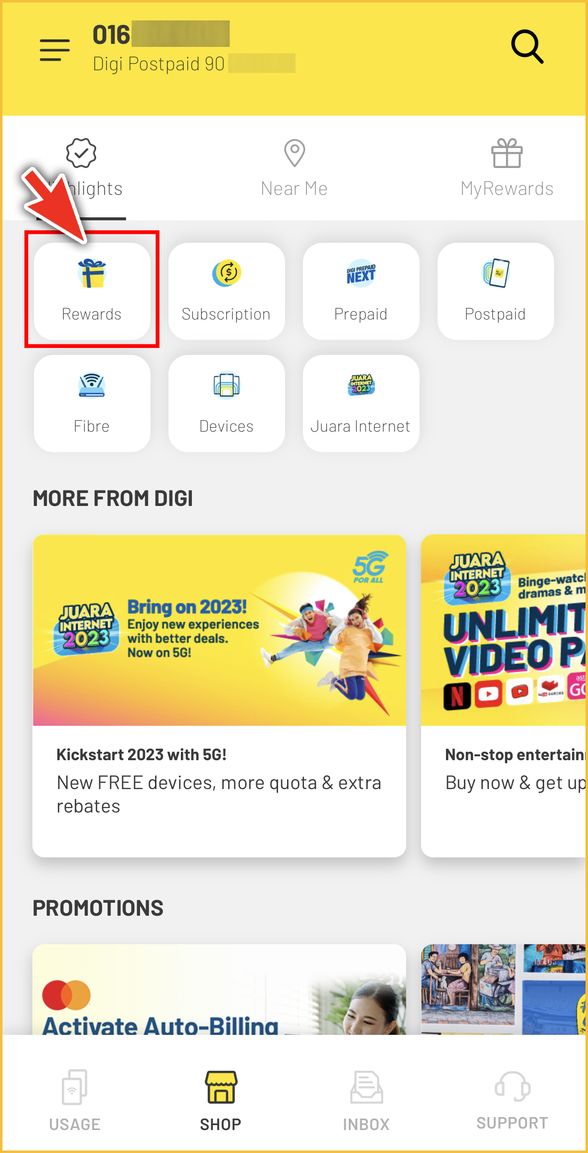 Step 1:打开 MyDigi 手机应用程序,点击下方第二个选项 “SHOP”。