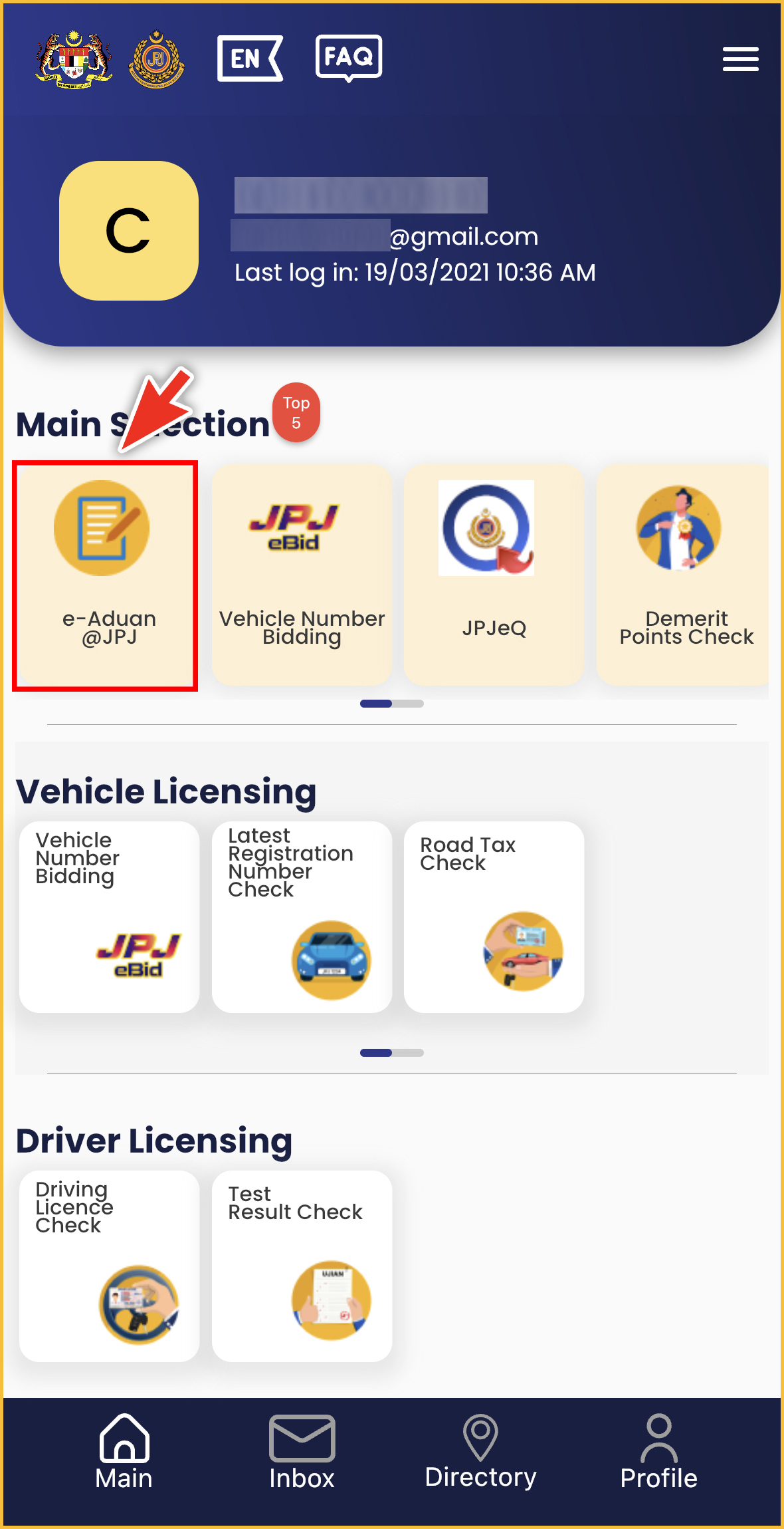 步骤 1:打开手机里的 MyJPJ 应用程序,点击 “e-Aduan @JPJ”。
