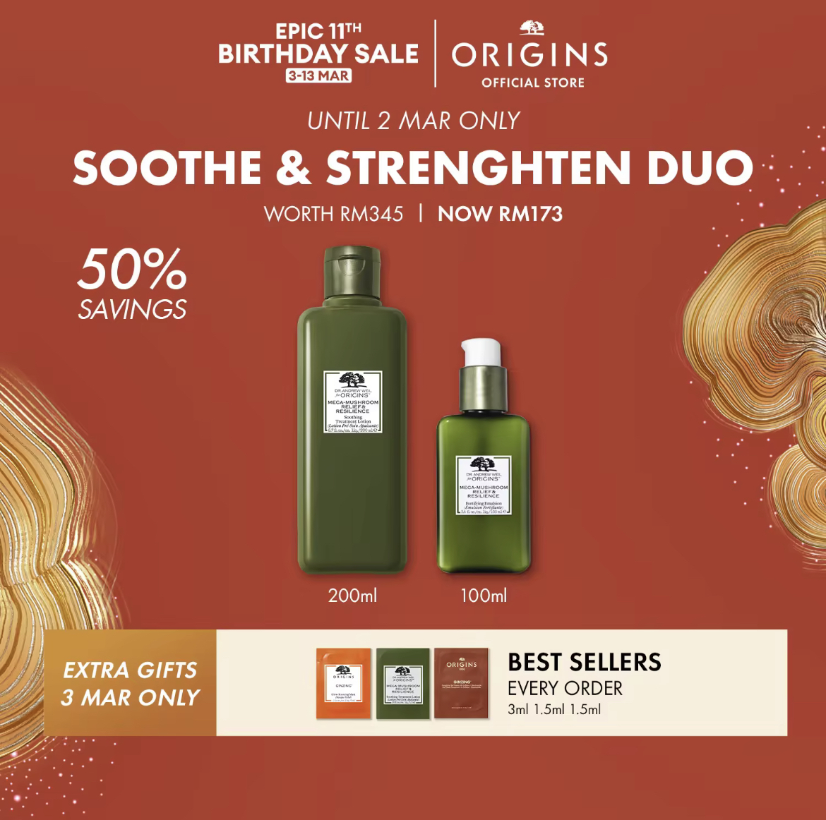 ▪ ⑥ Origins – 灵芝菇菌抗逆健肤纾缓水+醒神活力亮采面霜 2瓶套装