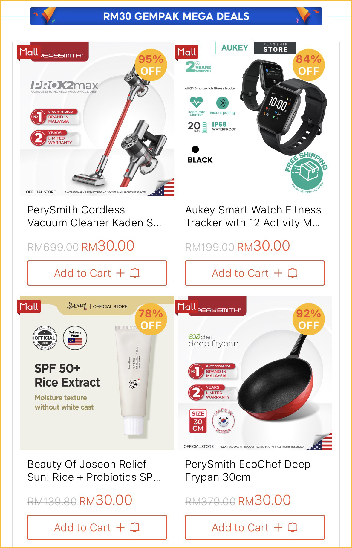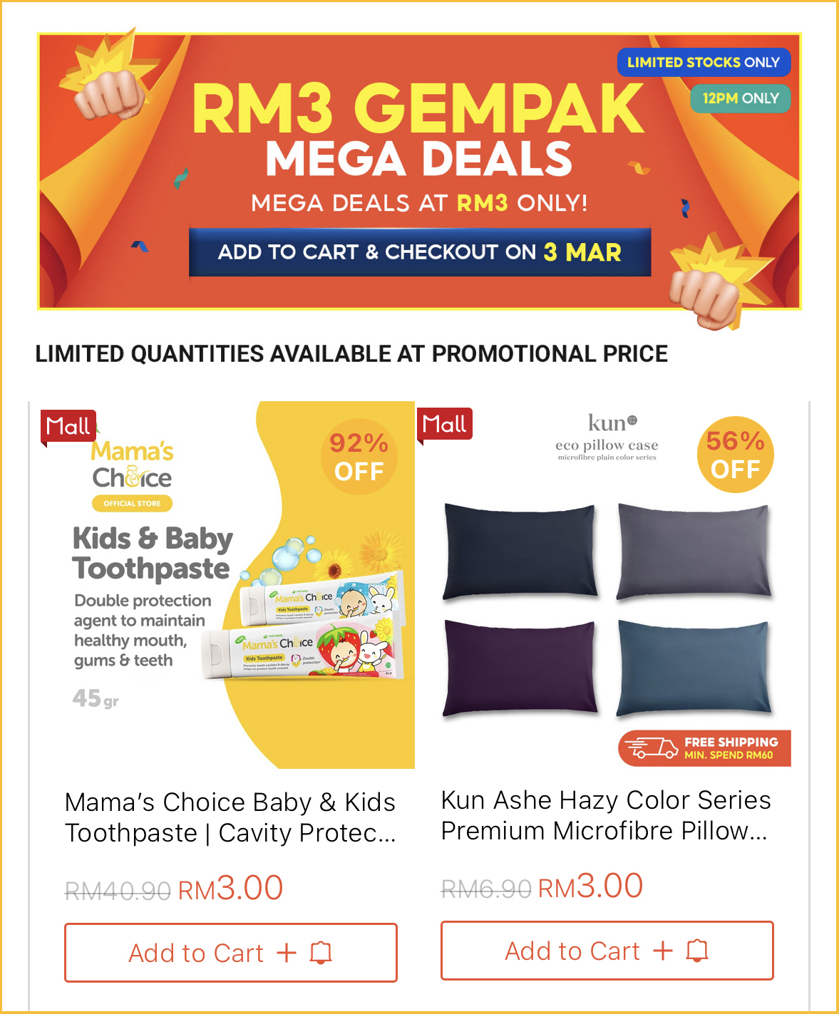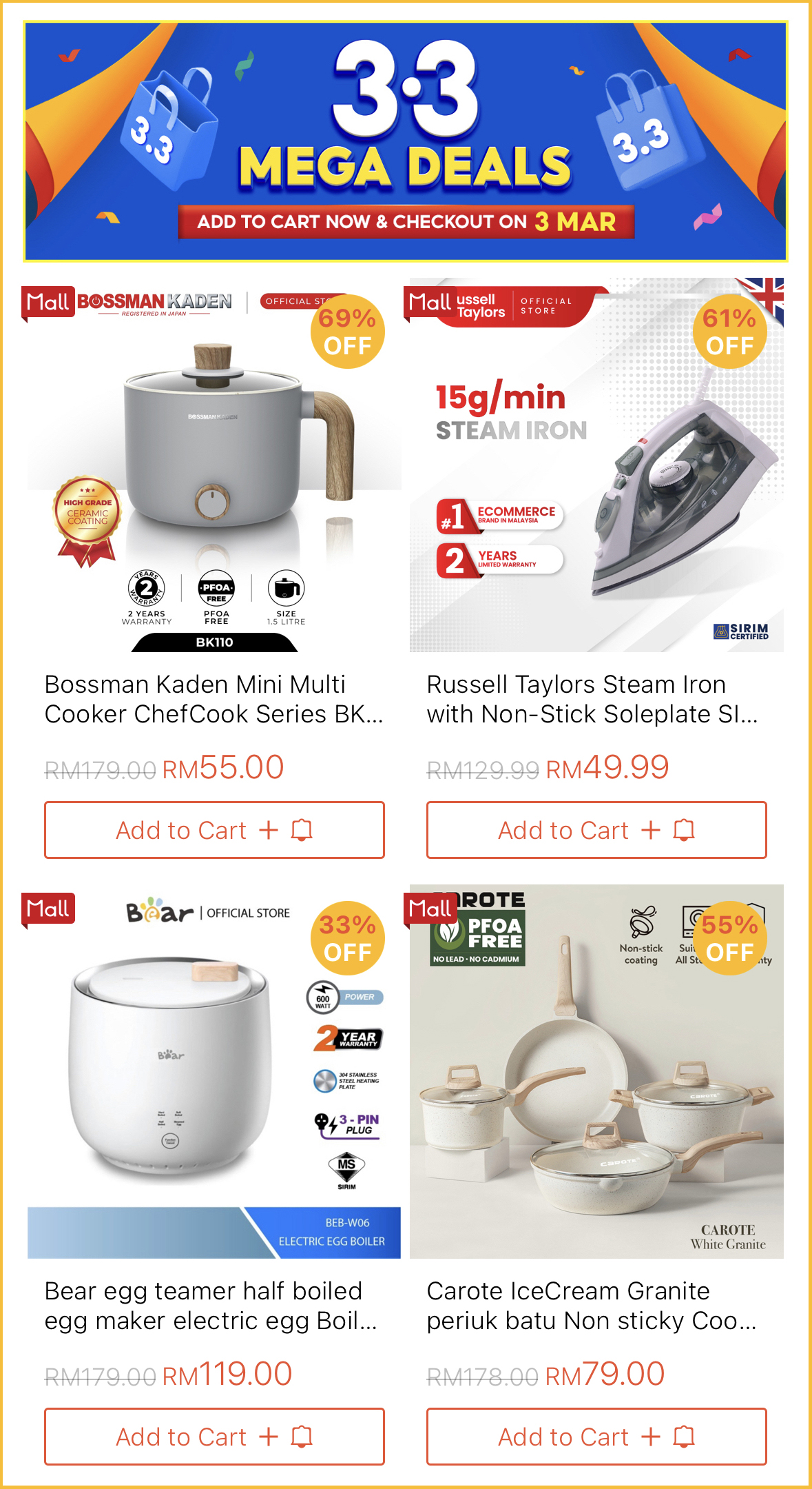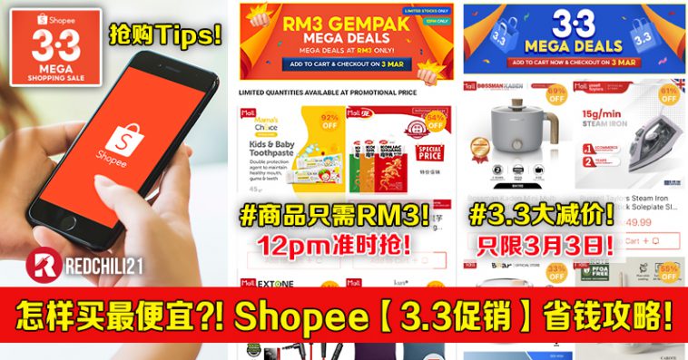 3月3日当天12pm,商家将推出RM3商品及RM30商品特价优惠,准时抢购!!