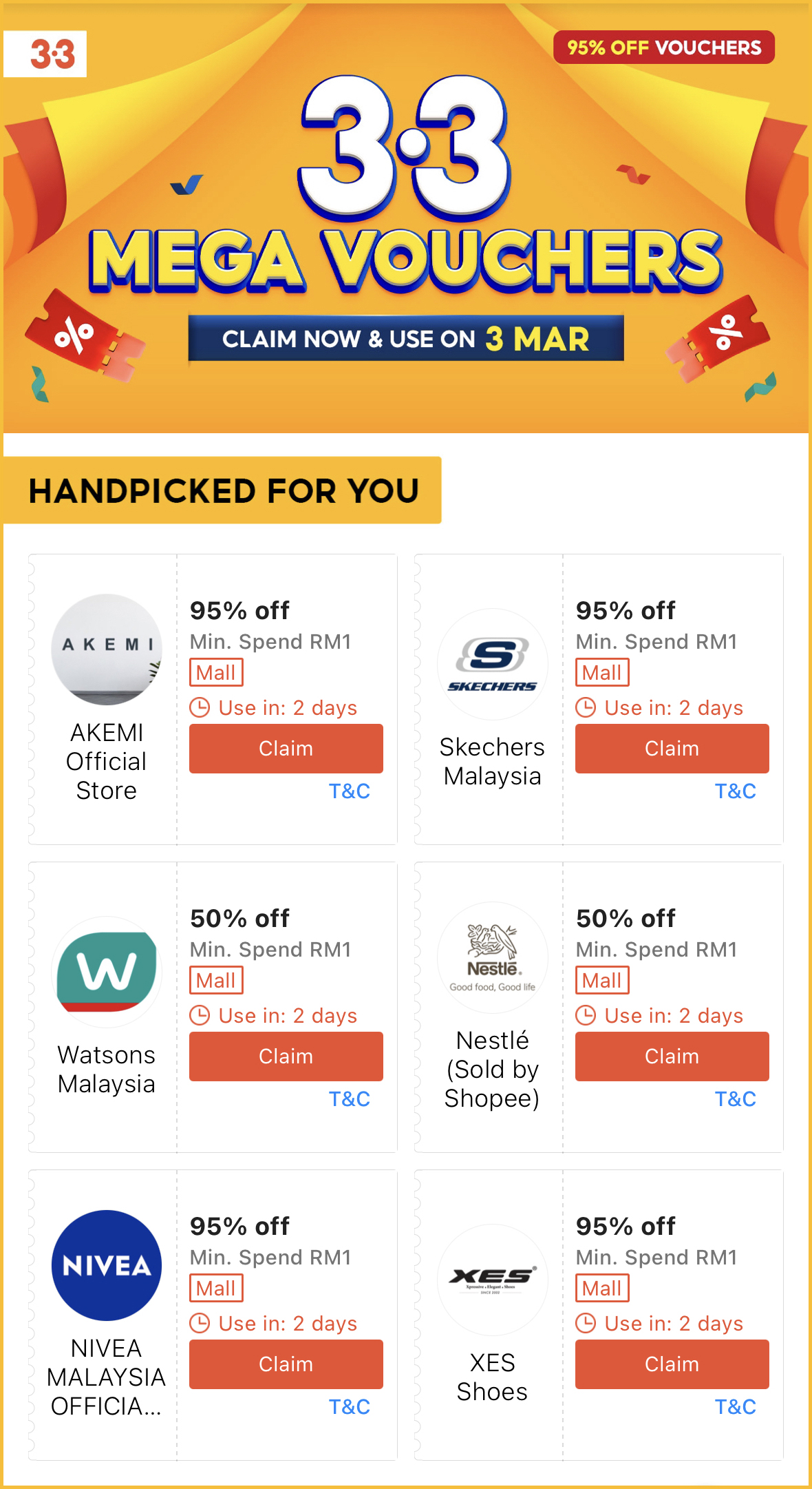 Shopee 各大商家推出高达95%折扣券,仅限于3月3日当天使用,现在就先领取吧!