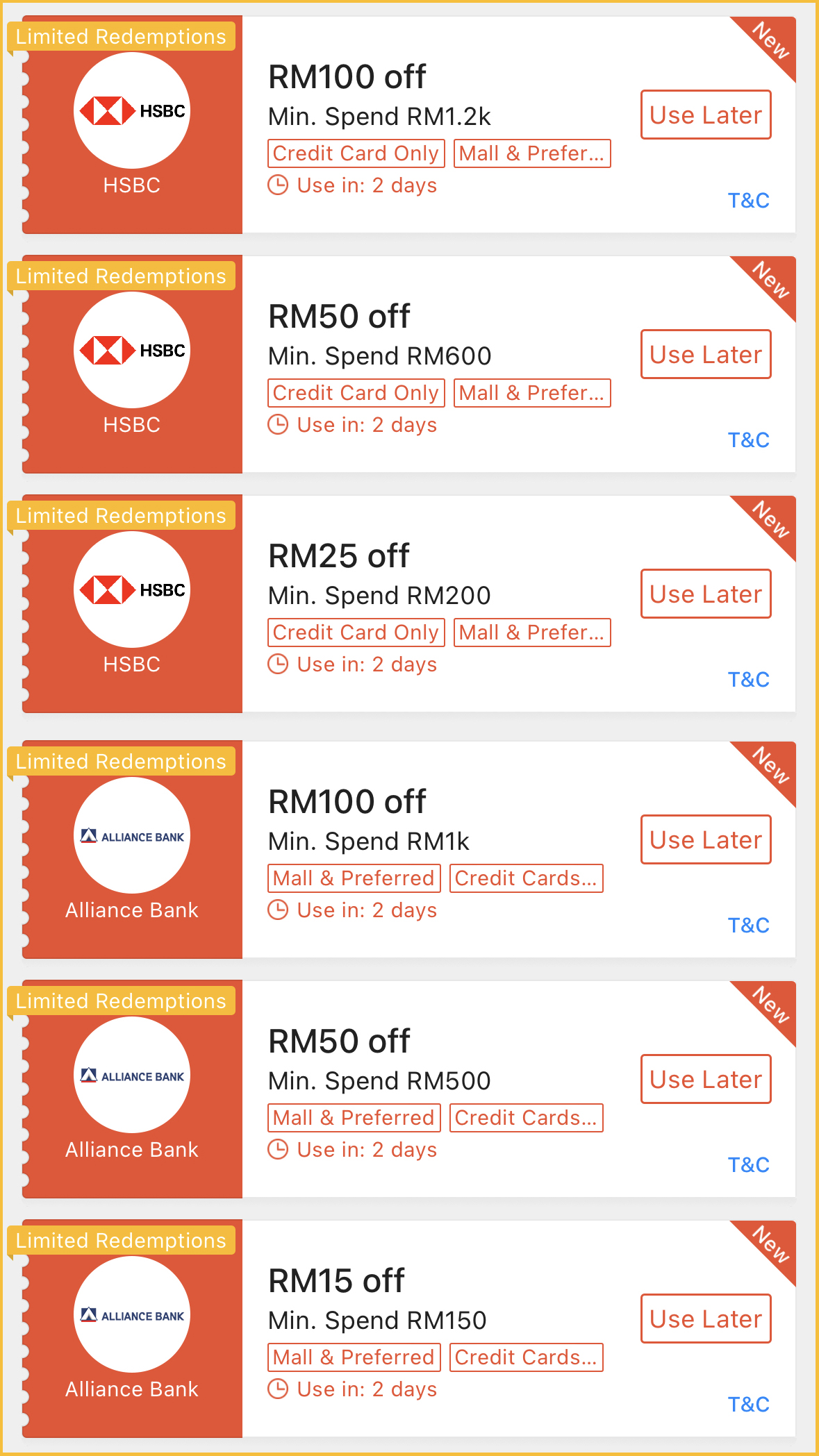 每天分为3个时段(12am、12pm、8pm)领取10%的回扣优惠券,折扣多达RM120!