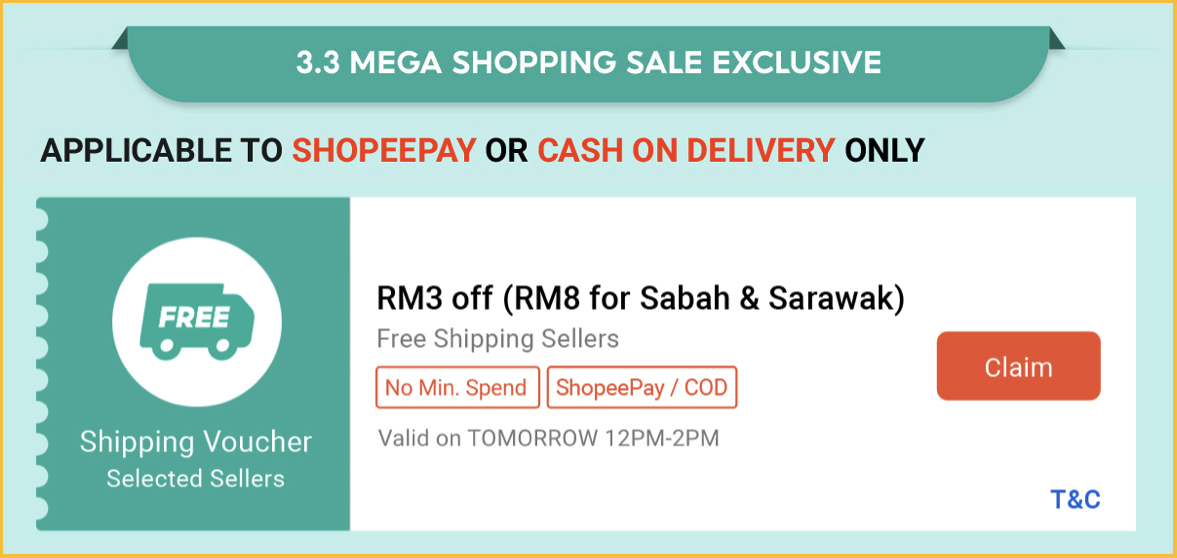 每天准时12pm领取 Shopee 免运券,先到先得哦!