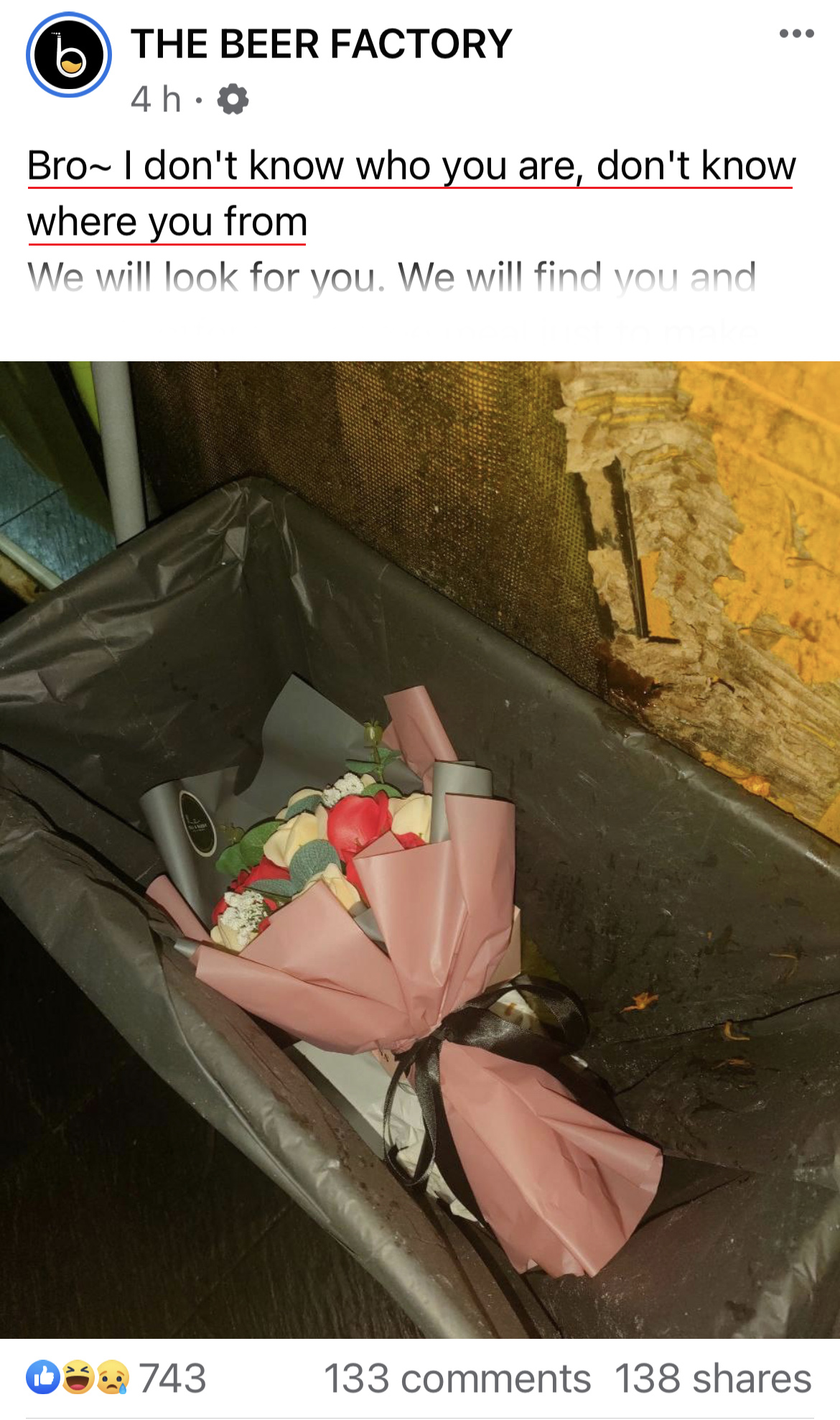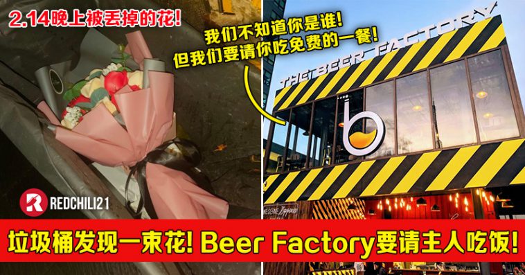 大马著名西餐厅酒吧—— The Beer Factory 今天在脸书粉专PO文,寻找把这束花丢进垃圾桶的主人公,为了安慰他“受伤的小心灵”,该店家决定请他吃免费的一餐!
