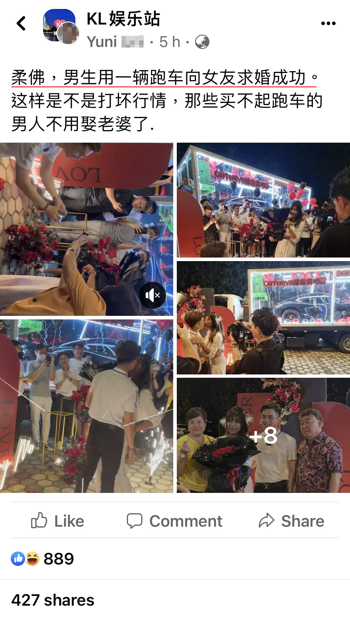 大马男子「送Porsche跑车」最牛逼的求婚仪式!网民感叹:情人节做坏行情越来越难了!