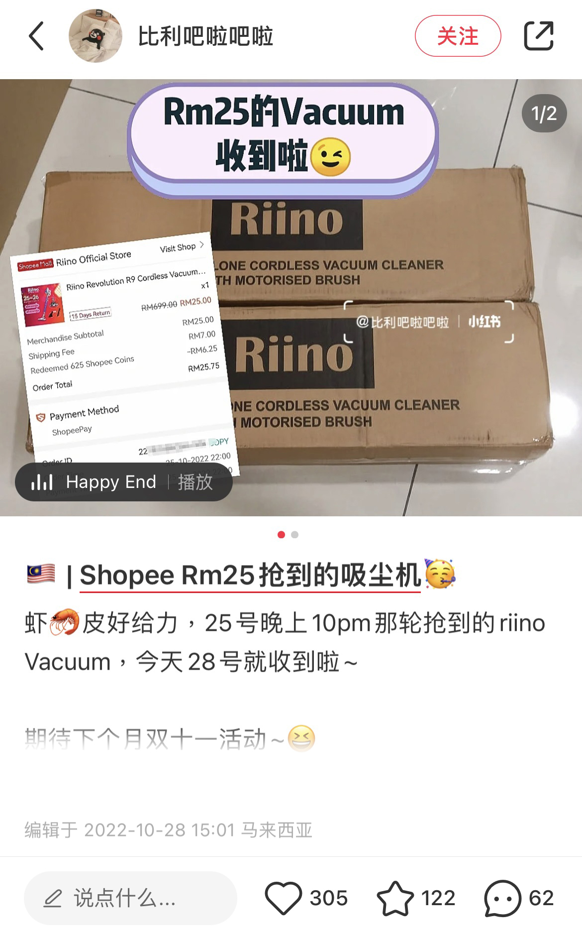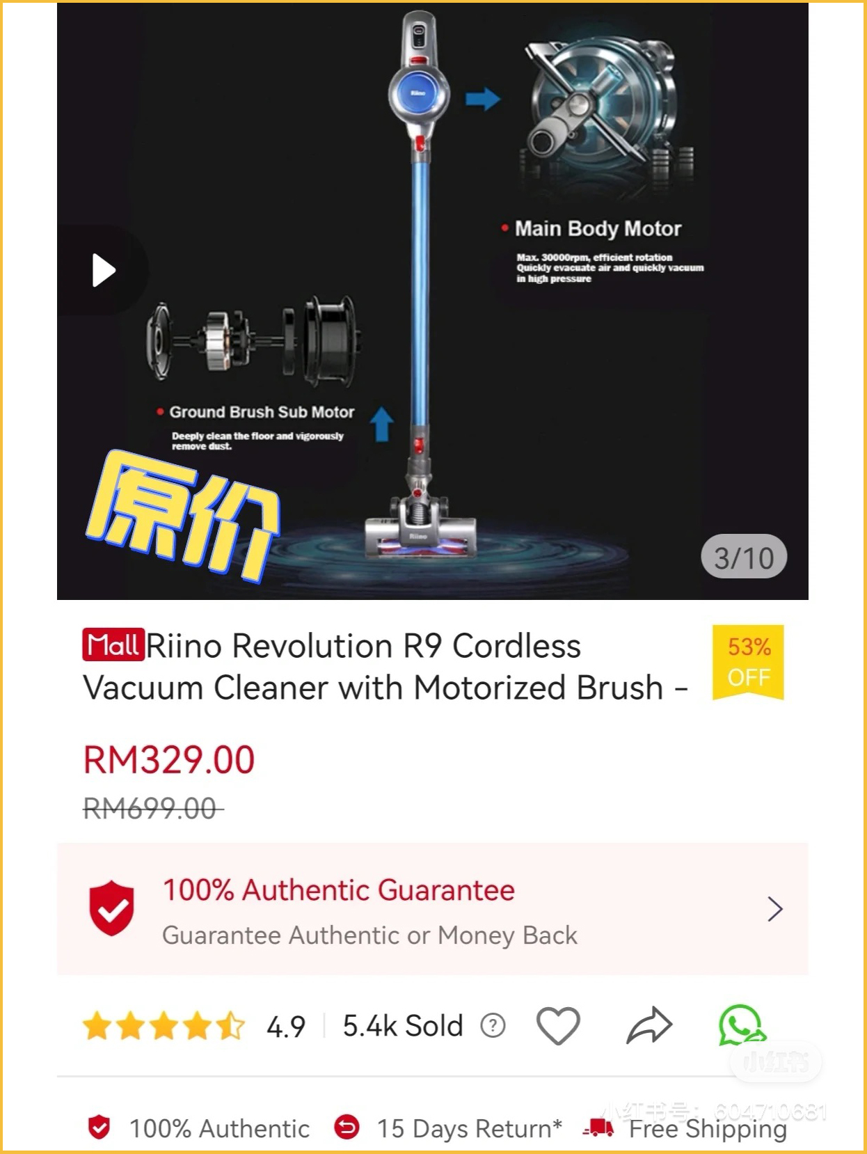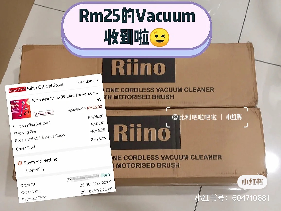 一名大马小红书博主日前分享自己的战利品,10月 Payday 促销日当天成功抢到 Riino 无线吸尘机,原价RM699下单的时候只花了RM25!
