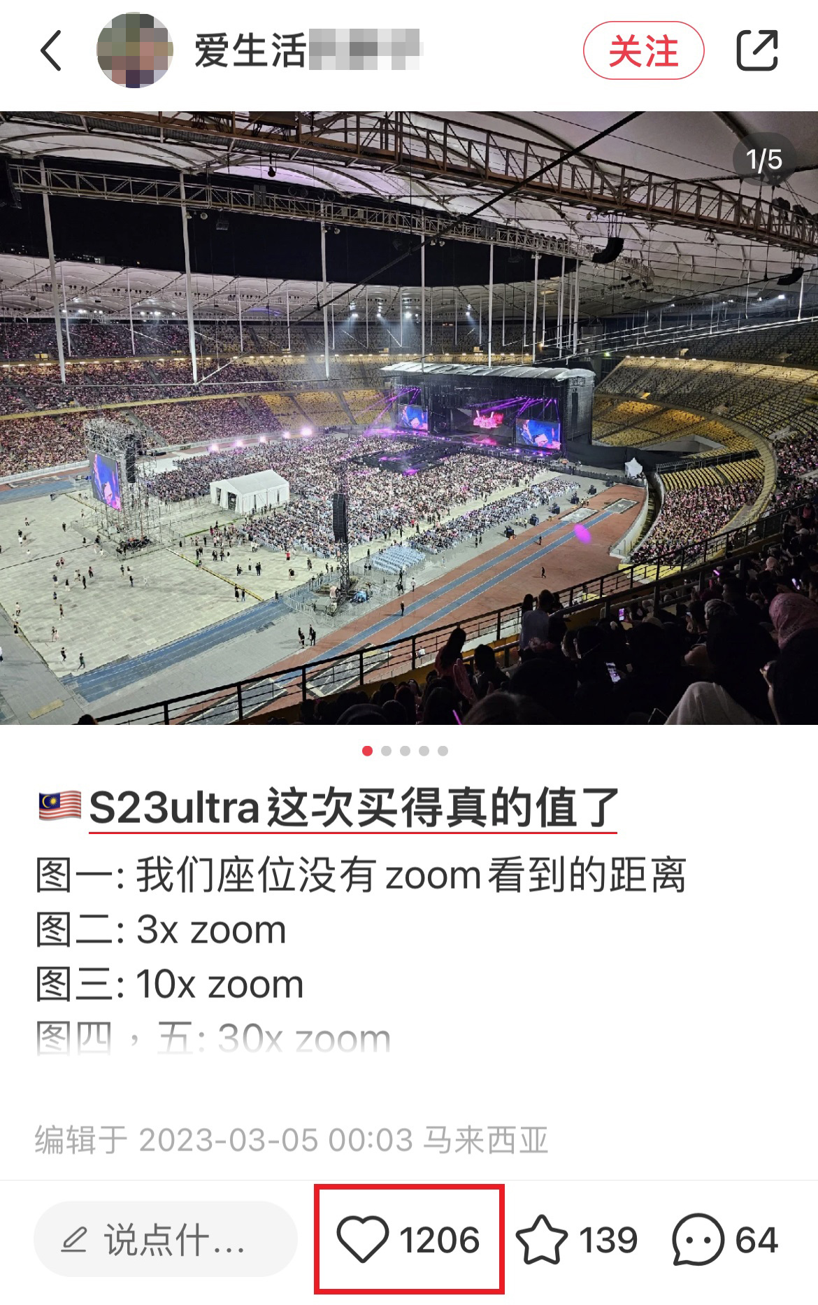 小红书一名大马男子声称自己曾是8年的 iPhone 用户,最近入手 Samsung 最新的 S23 Ultra 后,昨晚就带着去看 Blackpink 演唱会,放大30倍的照片惊艳全网!