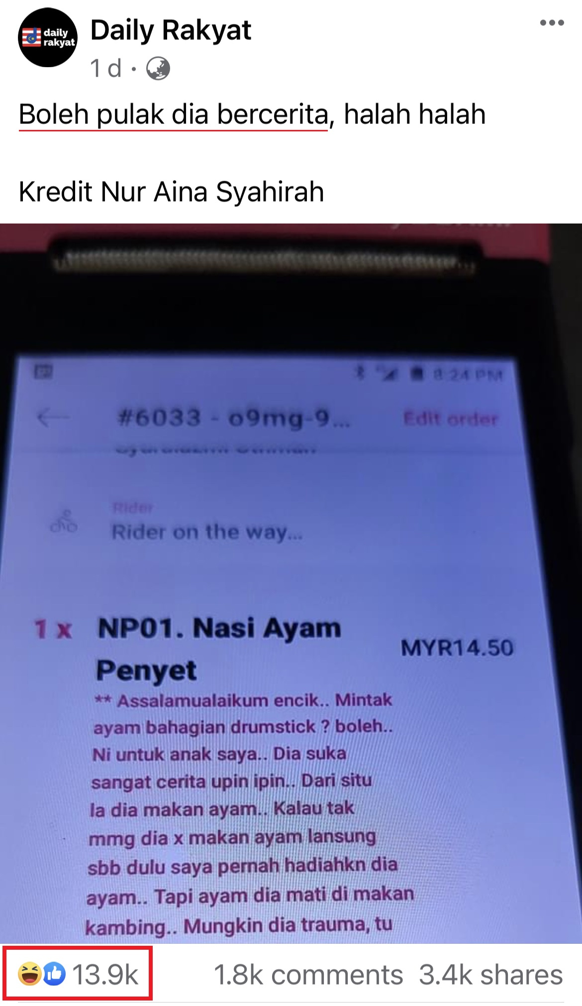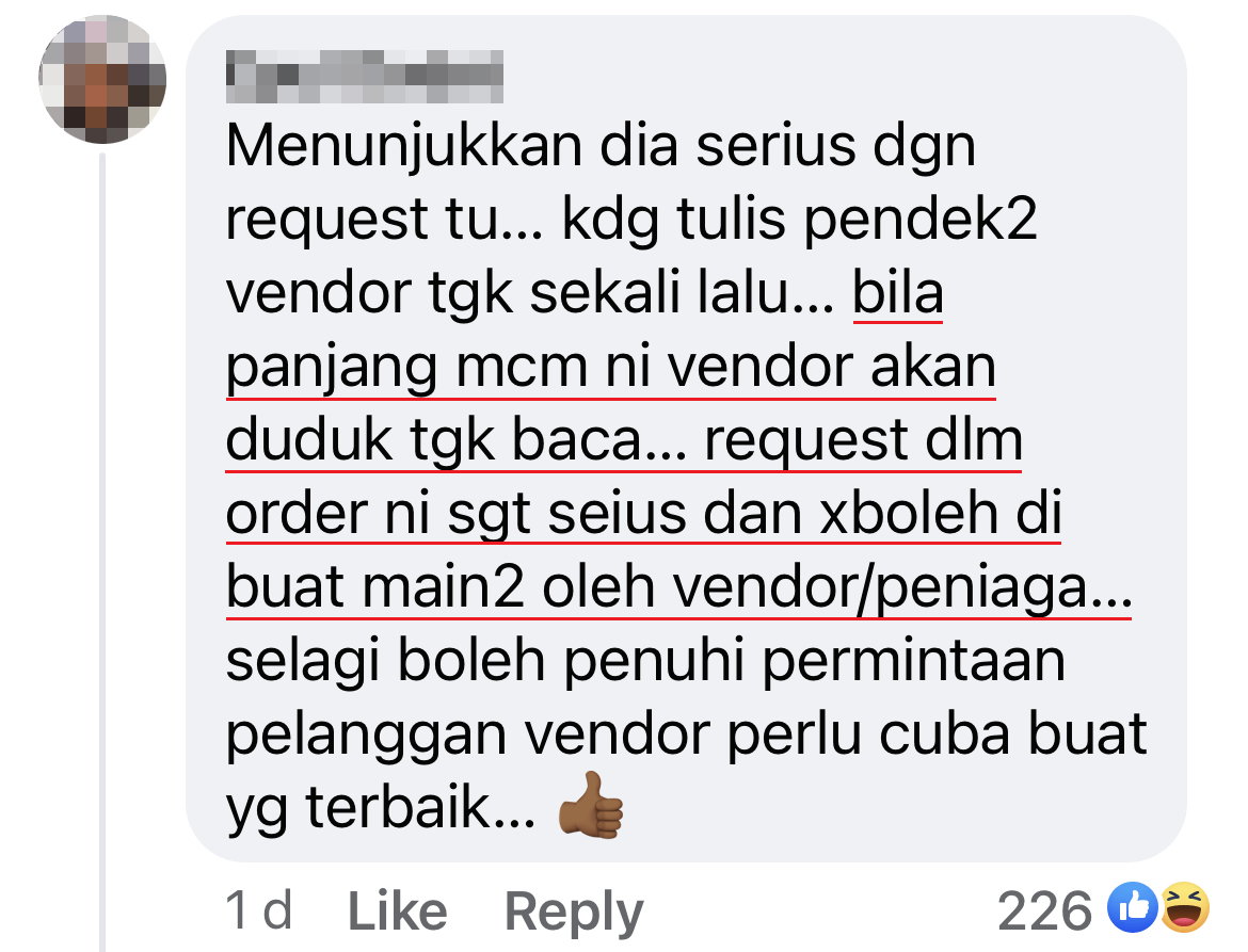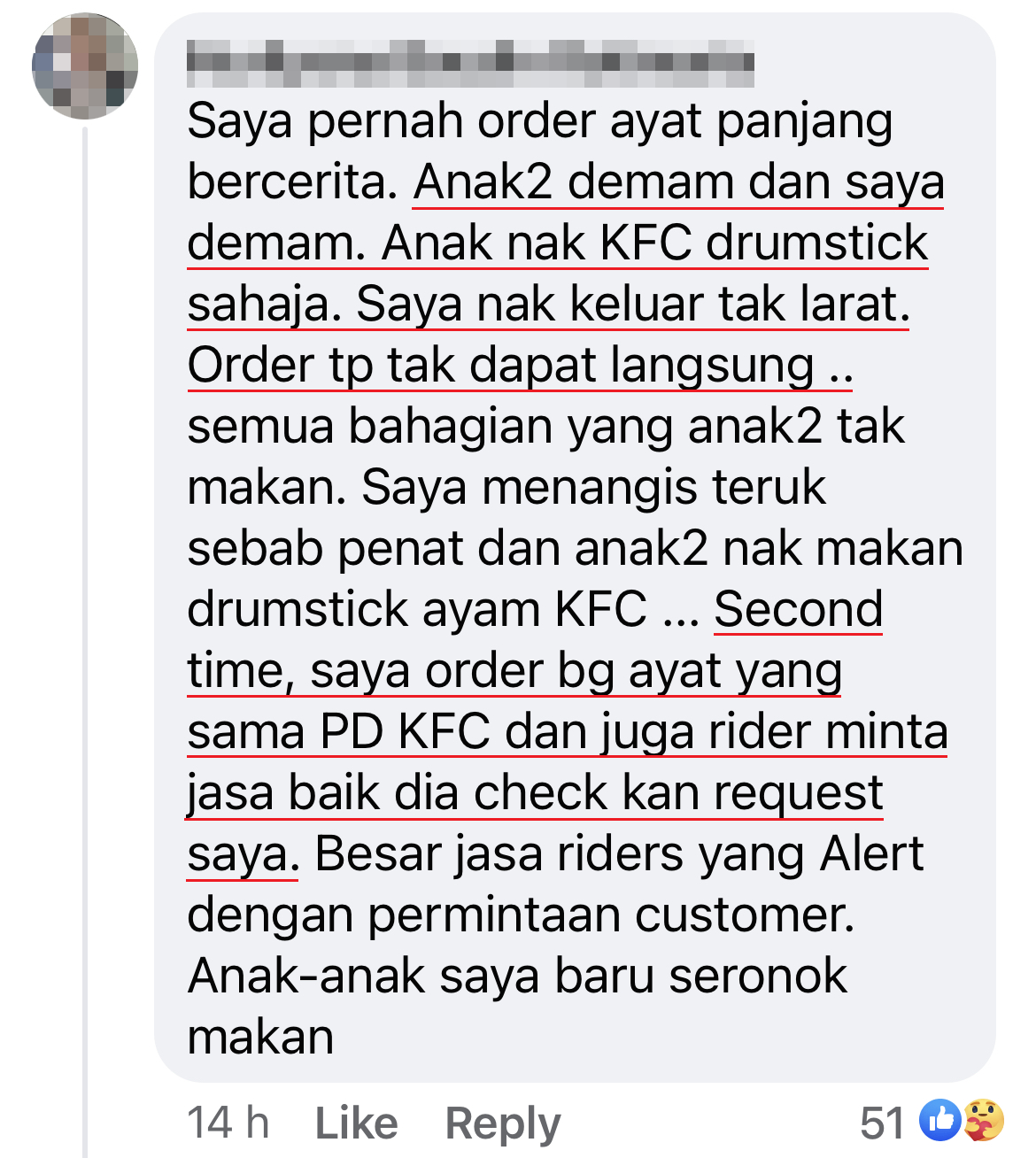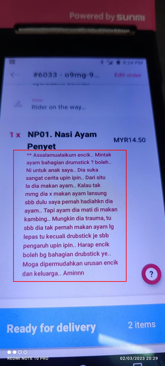 该名母亲透过 Foodpanda 应用程序点外卖,她点了一份炸鸡肉饭(Nasi Ayam Penyet)相信是给孩子的,为了让店家注意到她的需求,就在备注写了超长的故事,说道鸡腿对她孩子来说有多重要……