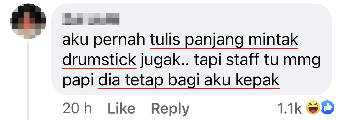 “老板,您好。请问可以给我换成鸡腿吗?可以吗… ?这其实是给我的孩子吃的。他很喜欢 Upin Ipin 的故事,因此就爱上吃鸡肉。”